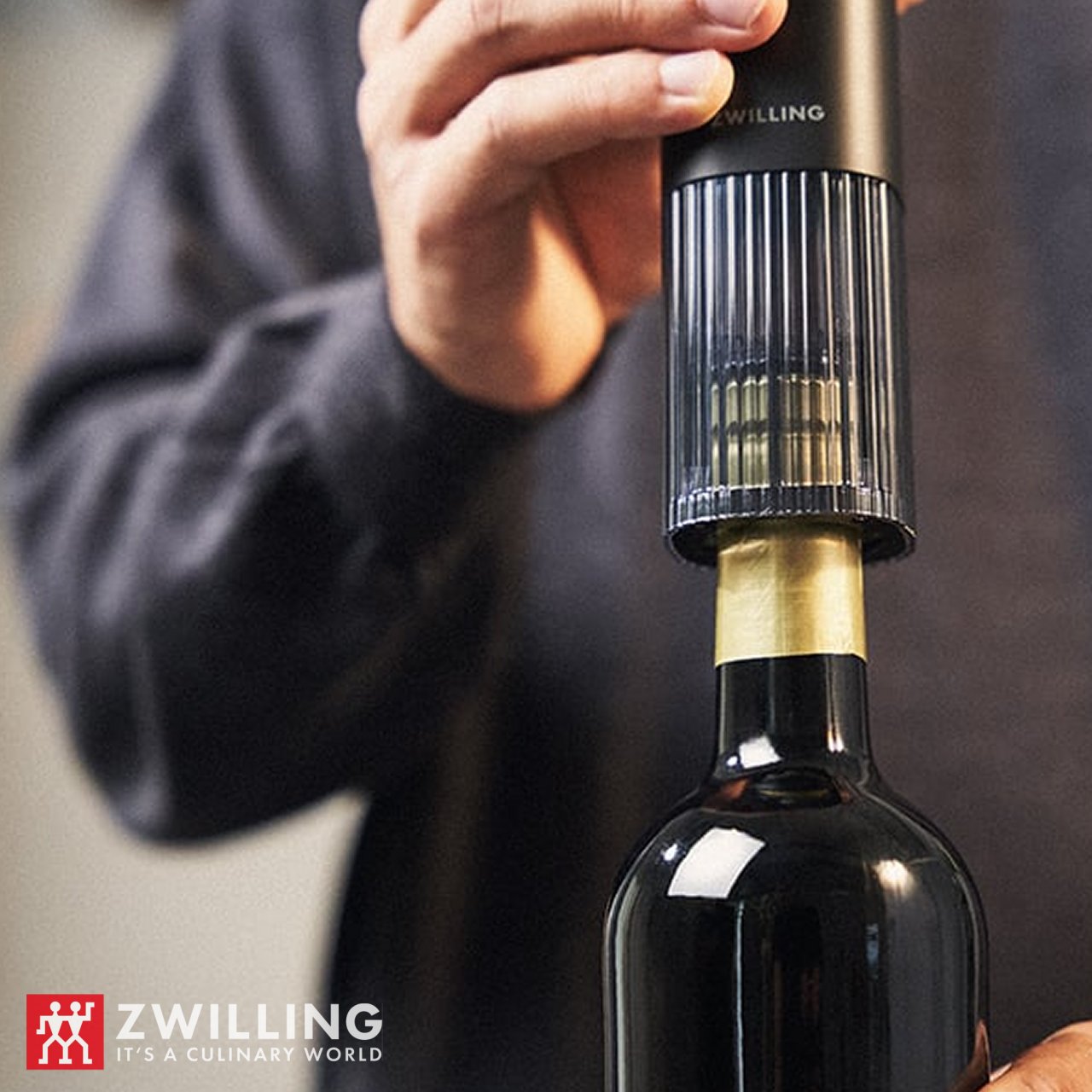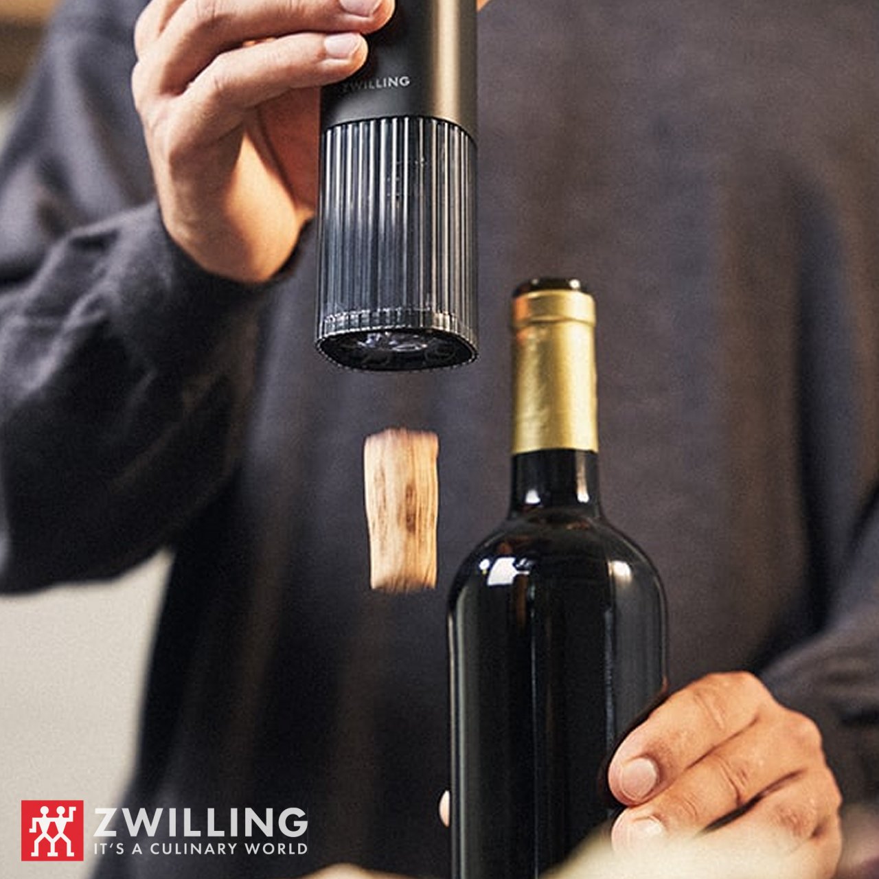 Ultimo arrivato in casa Zwilling, un accessorio fondamentale per ogni estimatore del buon vino, perché questo cavatappi elettrico consente di aprire ogni bottiglia semplicemente con il tocco di un pulsante.