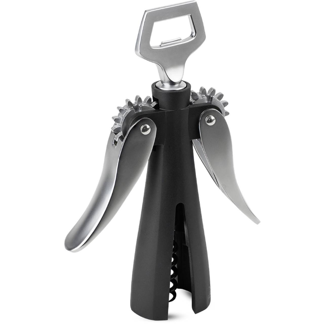 Idoneo all’uso quotidiano perché si adatta ad ogni tipo di tappo ed è dotato di un apribottiglie integrato, il suo design contemporaneo unisce il metallo cromato e la bachelite nera.