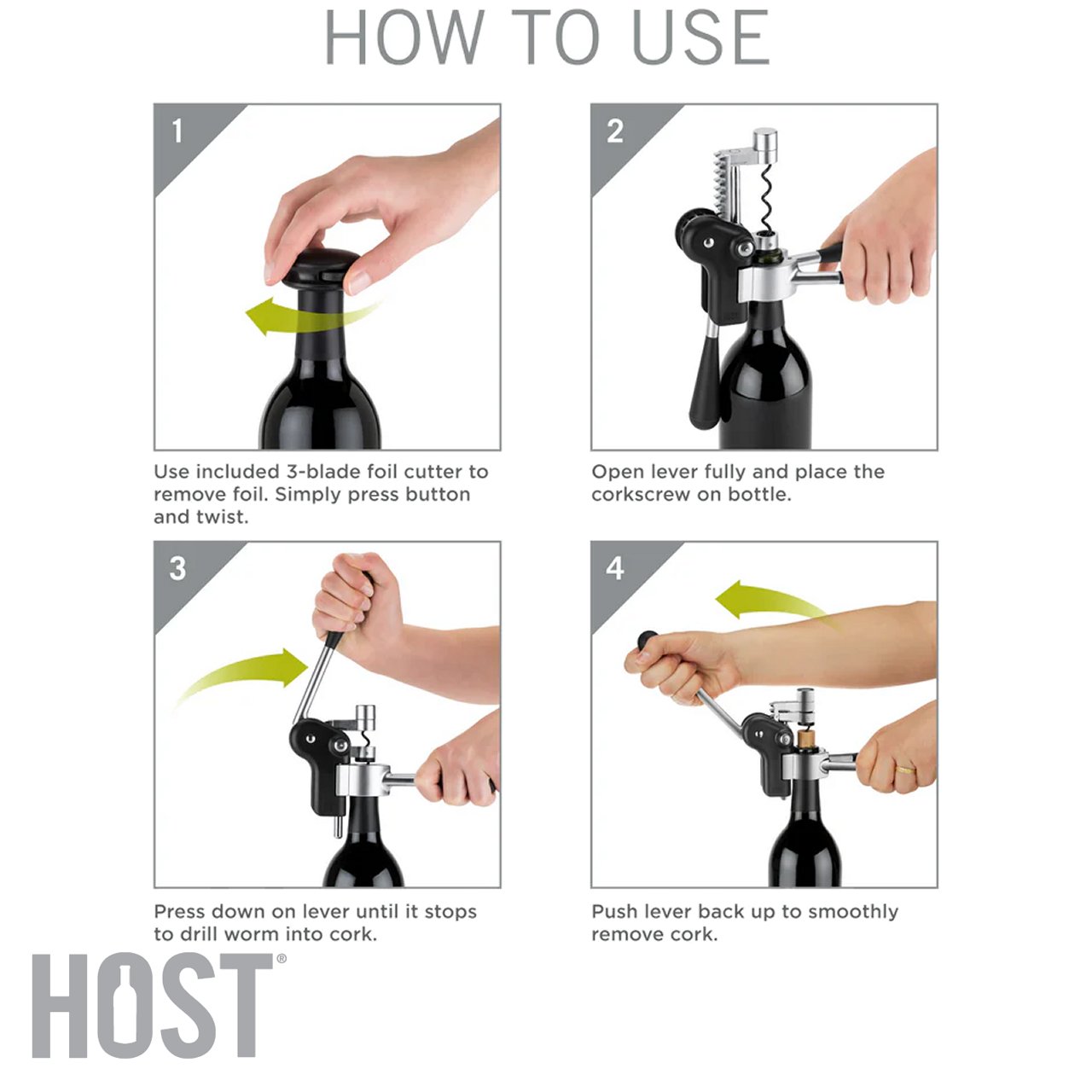 Host offre agli appassionati e agli intenditori di vino un'esperienza ancor più soddisfacente e completa. Ha ideato infatti accessori di elevata qualità e con funzioni speciali per una migliore degustazione. Il Twist aeratore regolabile, ad esempio, è un accessorio apprezzato da molti intenditori perché permette di decantare in modo più veloce e immediato le bottiglie che prediligi. Anche nel caso del Tilt aeratore di Host, si accorciano estremamente i tempi per decantare. Infatti, grazie a questo oggetto, il vino viene decantato nel momento stesso in cui lo si versa e più lo inclini più lo ossigeni. Il cavatappi a leva, invece, è stato realizzato in un robusto materiale, lo zinco pressofuso, e dotato di una impugnatura softtouch che permette di rimuovere il tappo con un facile movimento. Integrato anche di supporto, tagliacapsule a tre lame e verme extra.