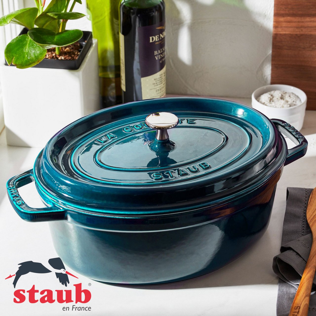Le domeniche e le occasioni speciali in famiglia avranno tutto un altro sapore quando porterai in tavola le tue preparazioni in questa cocotte ovale di Staub!