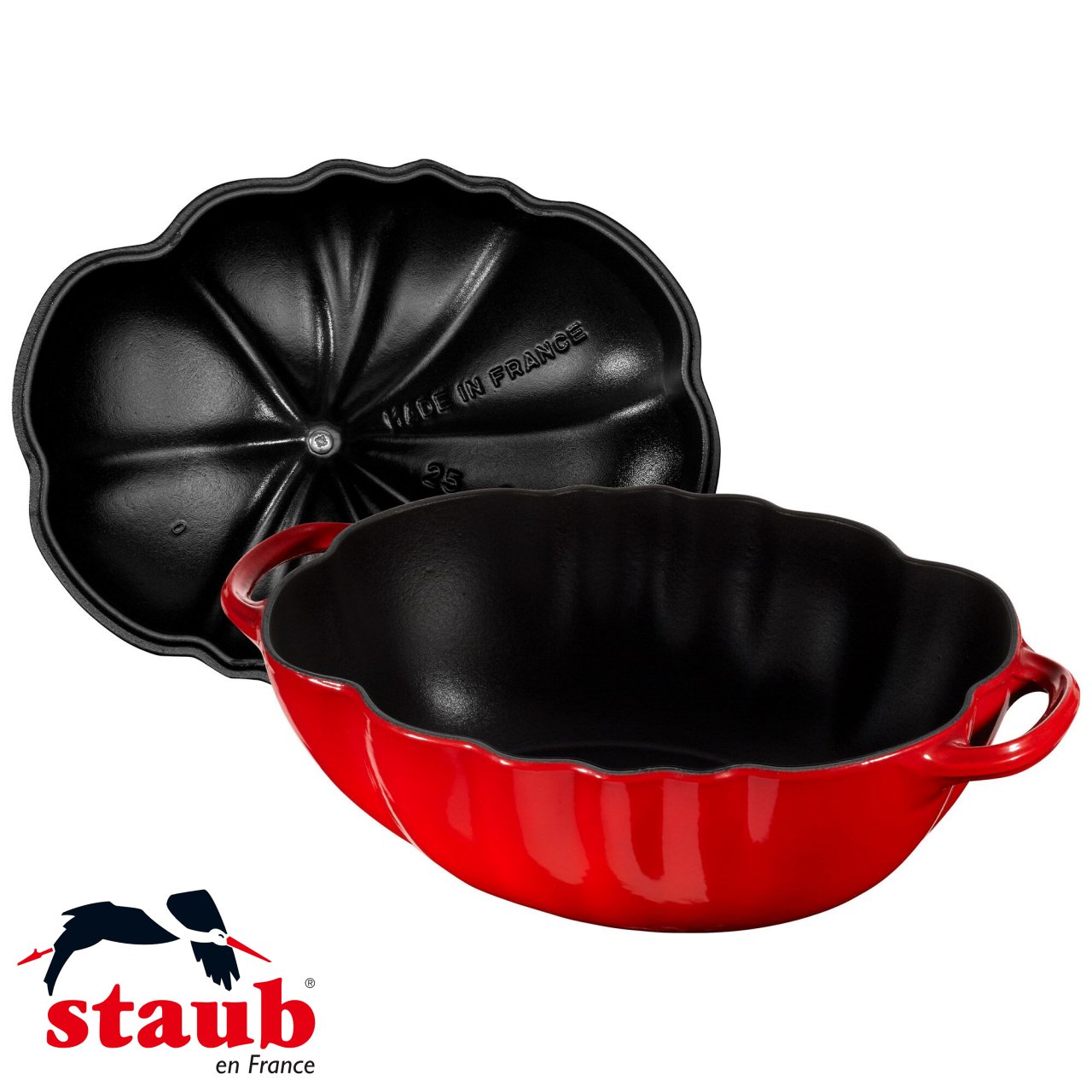 La Cocotte pomodoro Staub 25 cm ciliegia รจ una pentola in ghisa smaltata che combina un design artistico a forma di pomodoro con l’eccellenza della cucina francese e l’efficienza delle cotture lente.