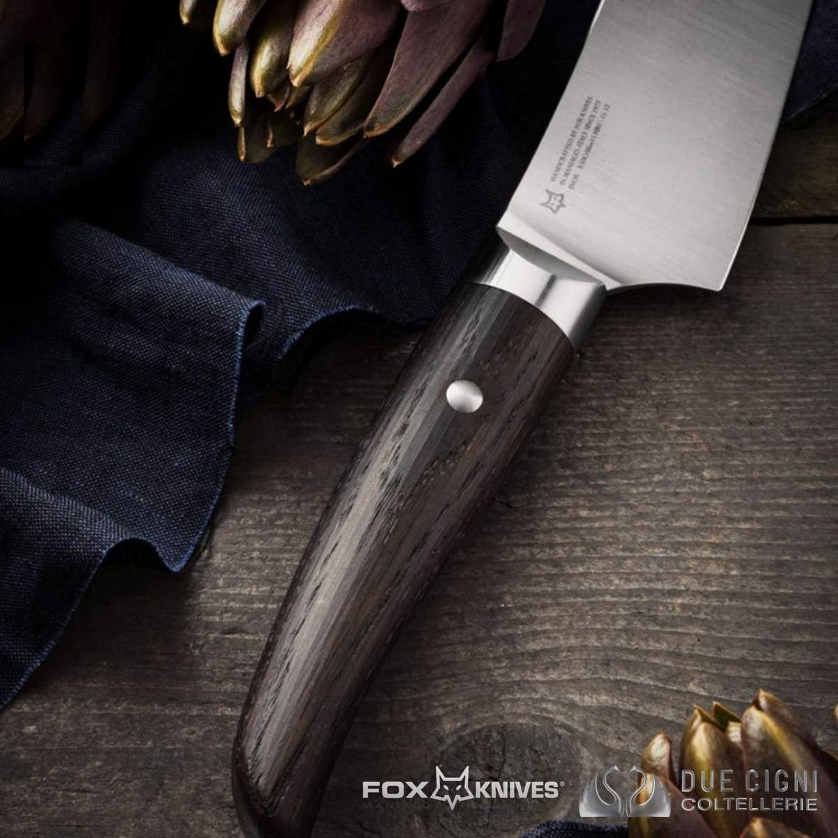 Lama da 18 cm in acciaio 4116 (X50crMoV15) che si adatta perfettamente al taglio di ogni alimento e manico in legno di quercia affumicata rendono questo coltello unico nel suo genere.