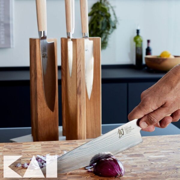 Che tu sia un cuoco amatoriale o esperto, non puoi non accorgerti dell’eccellente qualità del coltello Kai Shun con un manico in legno chiaro e lama da 20 cm damascata a 32 strati.