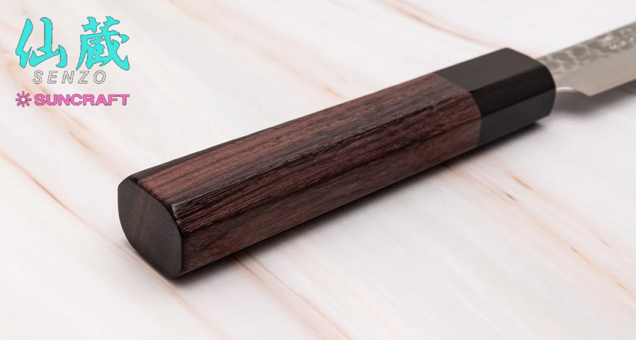 Il manico ha una forma ottagonale, tipica giapponese, ed è realizzato in legno di palissandro con una ghiera in legno pakka nero e risulta particolarmente ergonomico e comodo da impugnare.