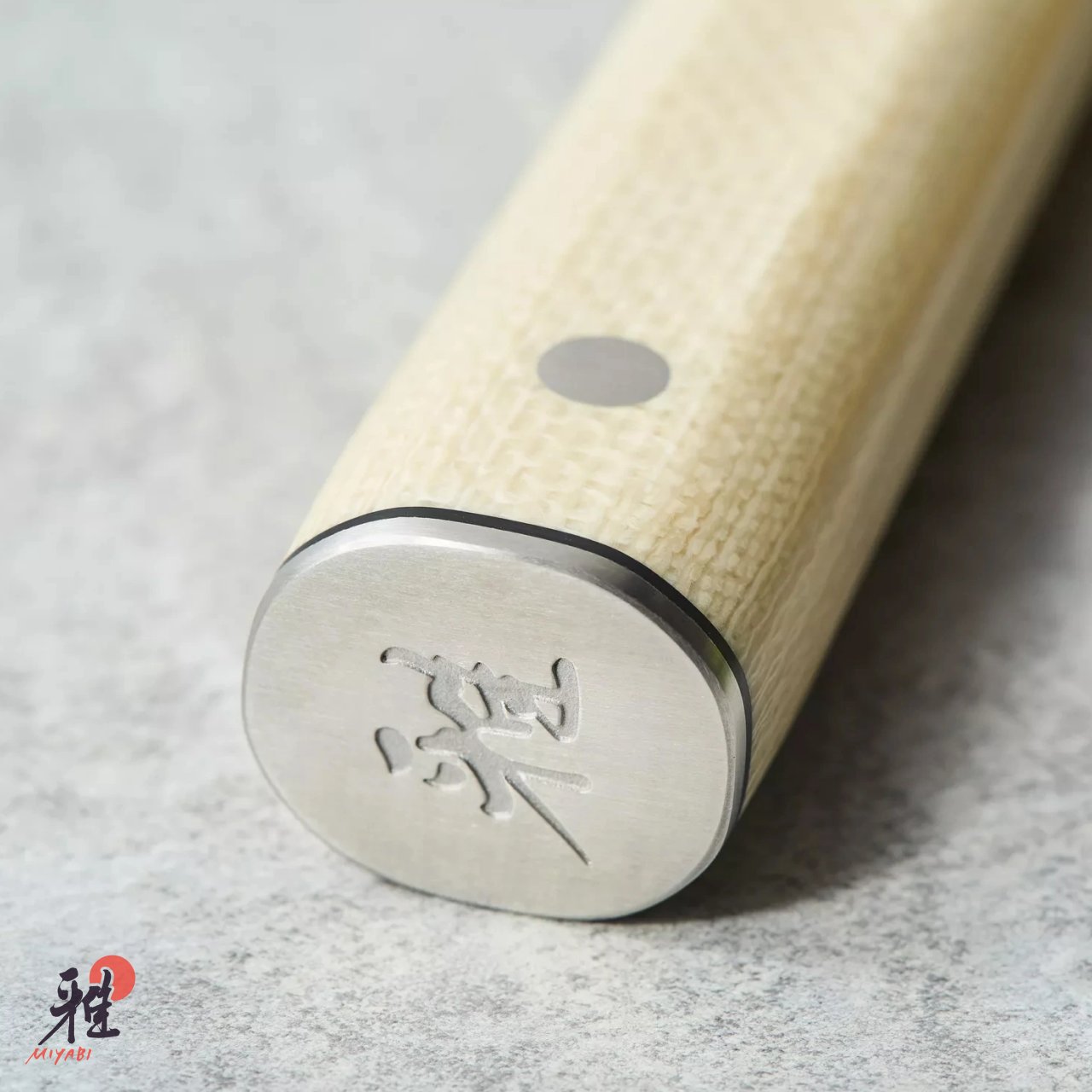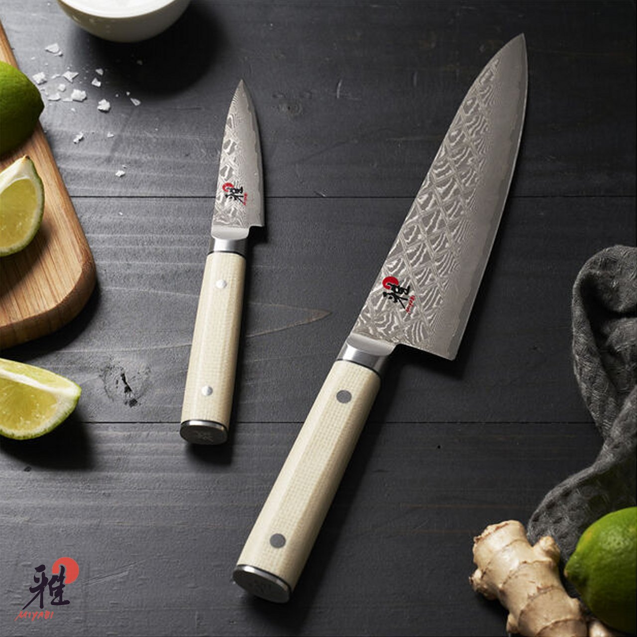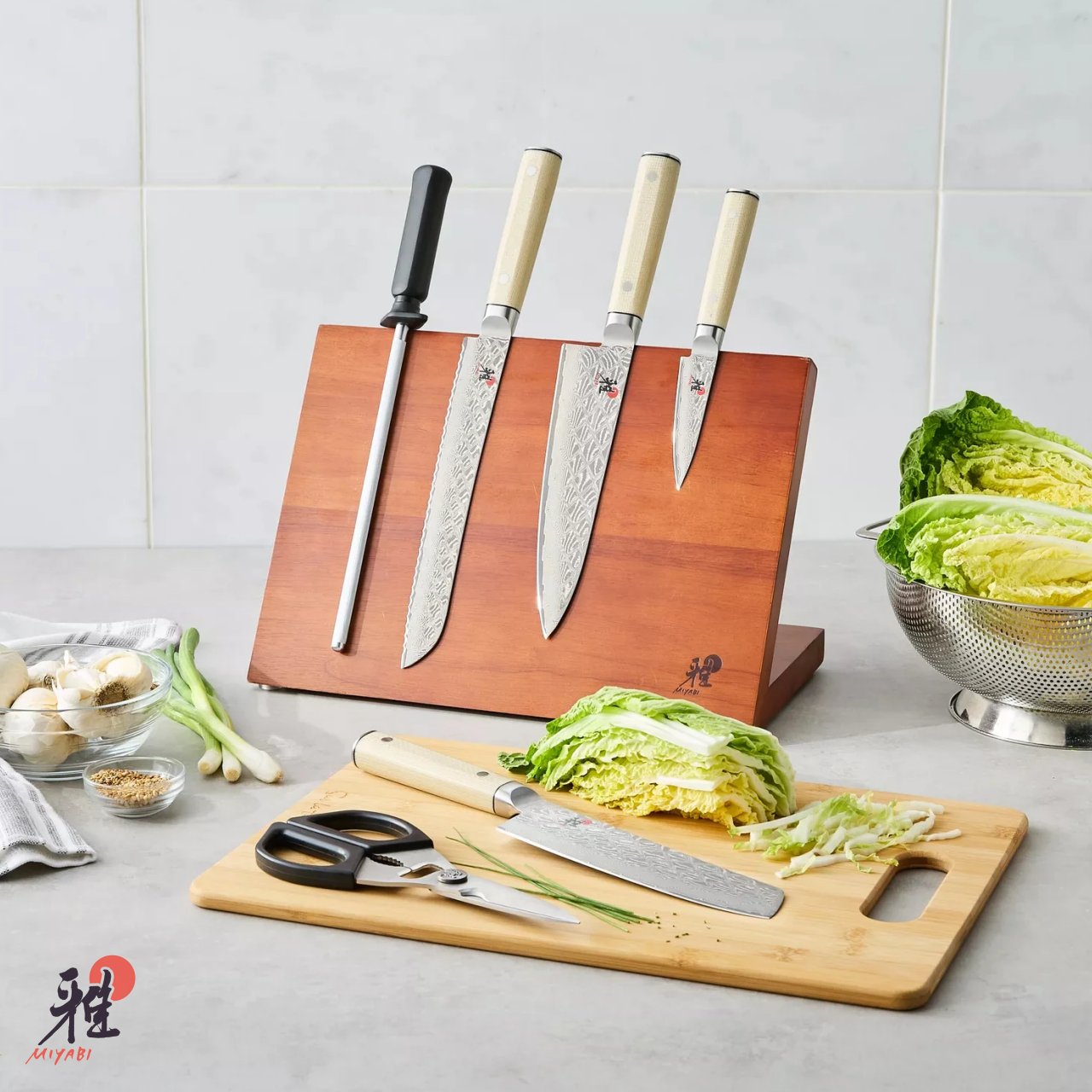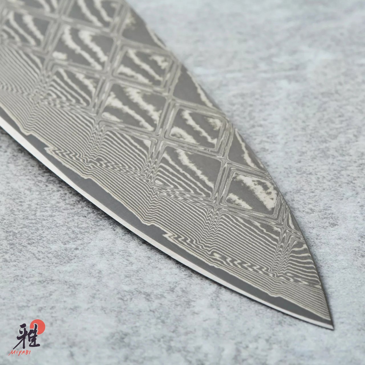 • Serie 5000MCD: la linea di coltelli Miyabi unisce bellezza e prestazioni grazie a un design unico, il manico in betulla Masur e una lama affilata su entrambi i lati con lavoraziona a mano tradizionale Honbazuke, che dona un tagliente estremamente performante grazie a un angolo tra 9,5° e 12°. Altro plus è il cuore di acciaio in polvere MicroCarbide MC63 incassato in 100 strati di acciaio;