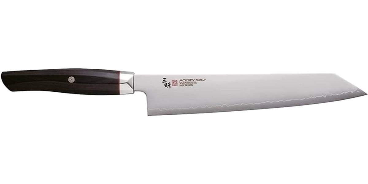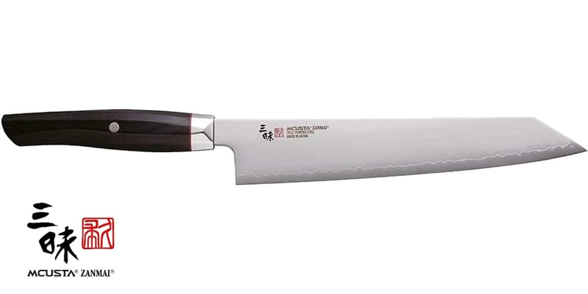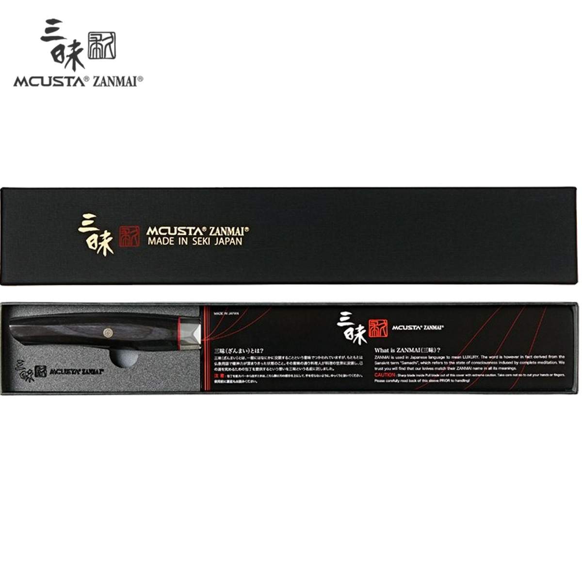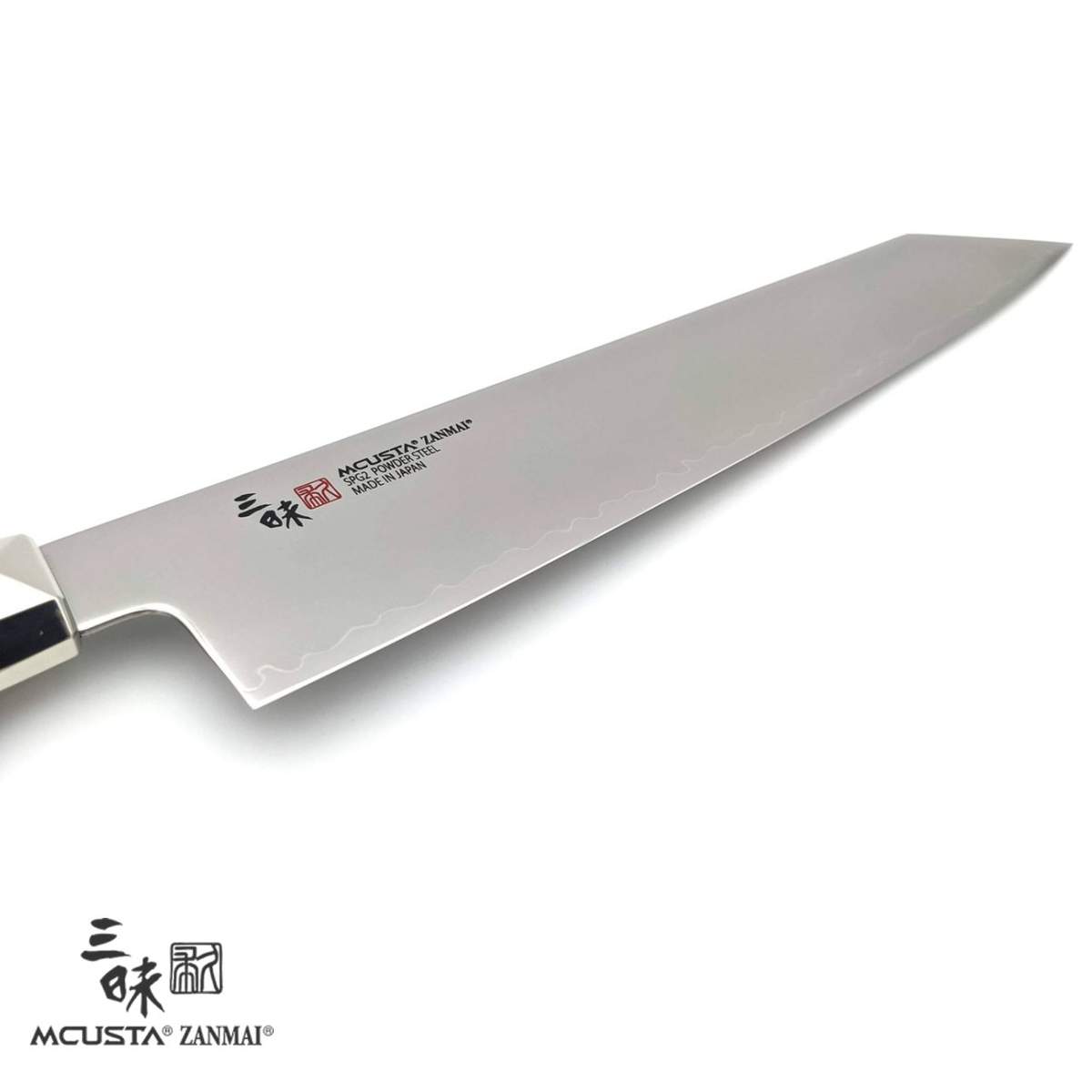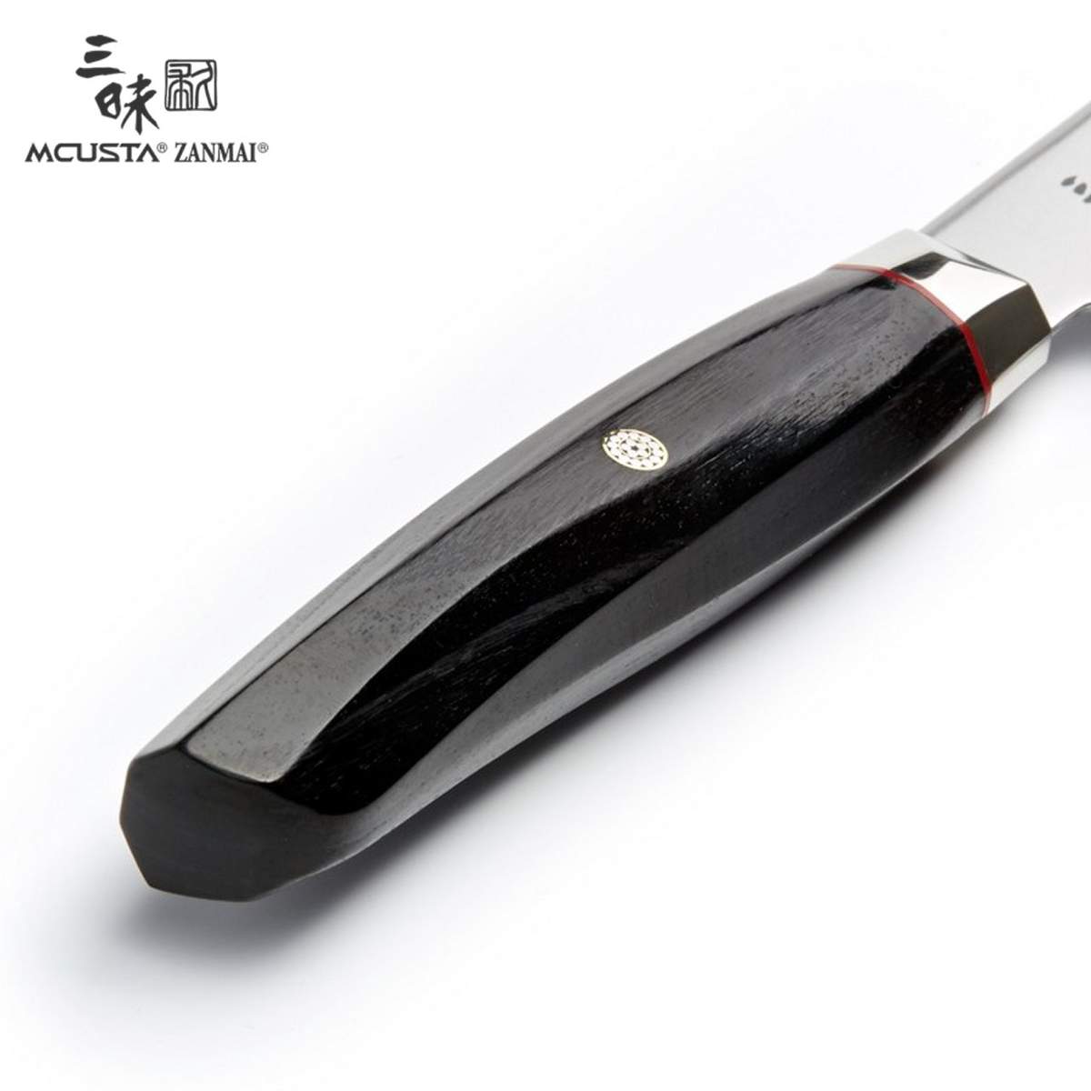 Mcusta affilando questo coltello con un bisello doppio, riesce a soddisfare le esigenze degli utenti occidentali, rendendo cosi il Kiritsuke grazie al suo bordo dritto un'ottima alternativa al coltello Gyuto o a quello da Chef.