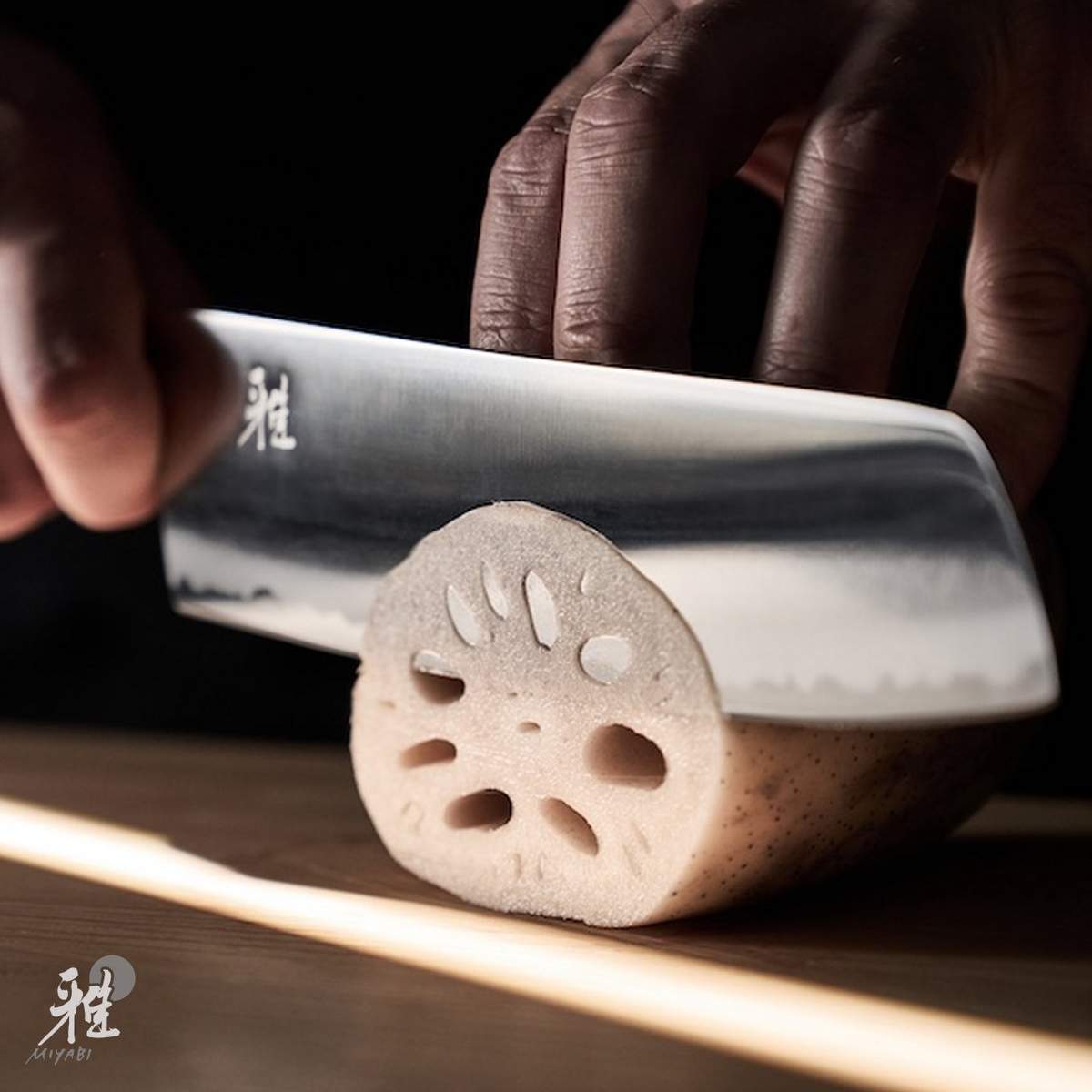 Ogni lama viene rifinita a mano con un processo in tre fasi per ottenere un’affilatura simile a quella di un bisturi, garantendo tagli netti che non schiacciano le fibre degli alimenti, inoltre il suo profilo sottile e il bordo sabbiato richiamano l’estetica delle spade samurai, riducendo l’attrito durante il taglio.