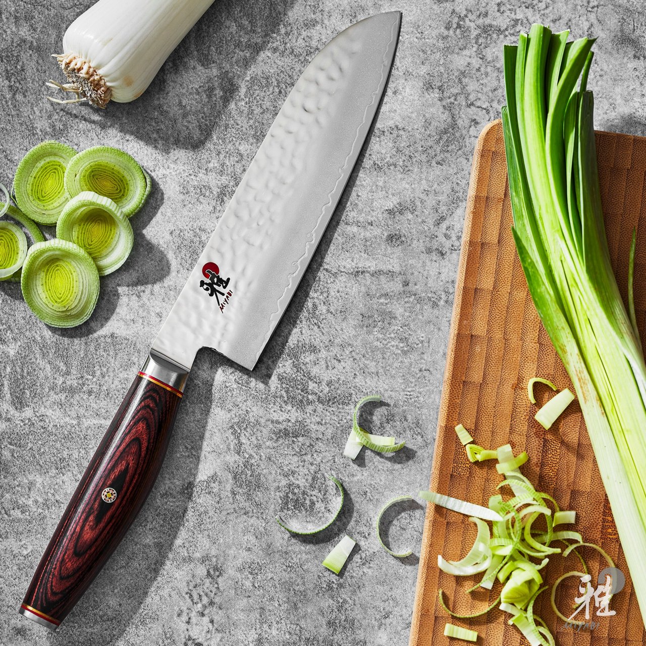 • Serie 5000MCD: la linea di coltelli Miyabi unisce bellezza e prestazioni grazie a un design unico, il manico in betulla Masur e una lama affilata su entrambi i lati con lavoraziona a mano tradizionale Honbazuke, che dona un tagliente estremamente performante grazie a un angolo tra 9,5° e 12°. Altro plus è il cuore di acciaio in polvere MicroCarbide MC63 incassato in 100 strati di acciaio;