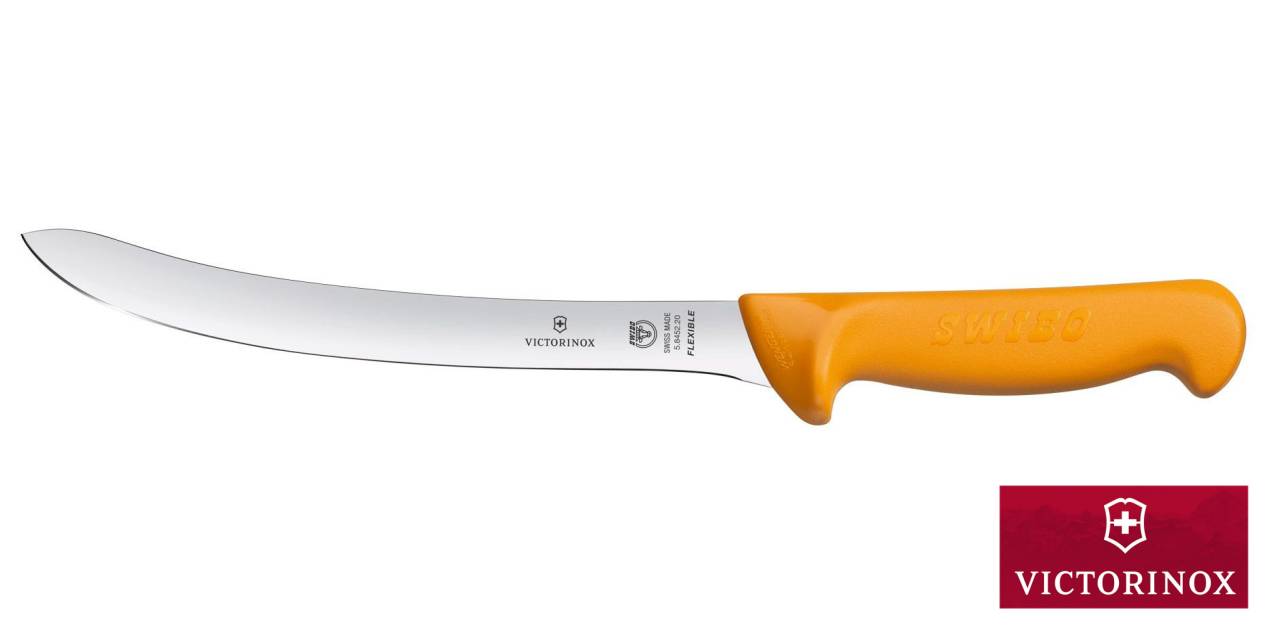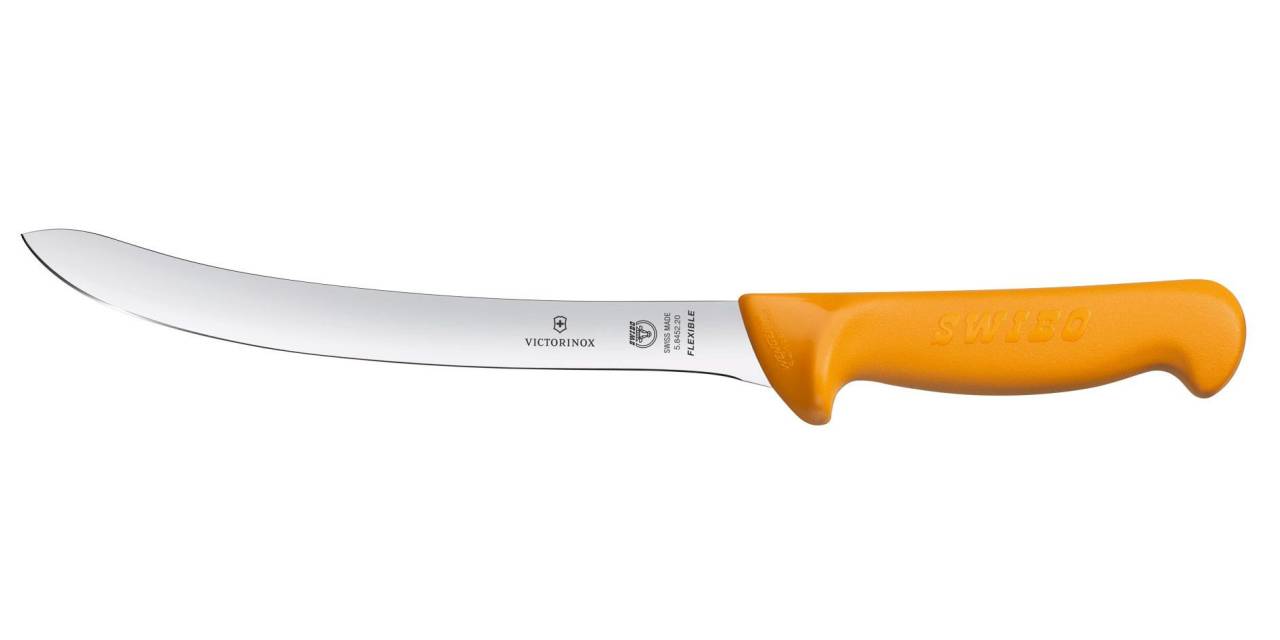 Coltello con lama flessibile a scimitarra della linea Swibo, concepita per i professionisti perché dotati di manici dai colori brillanti facilmente riconoscibili ma soprattutto sagomati e realizzati con un materiale antiscivolo che offre una presa salda anche con mani bagnate o con i guanti.