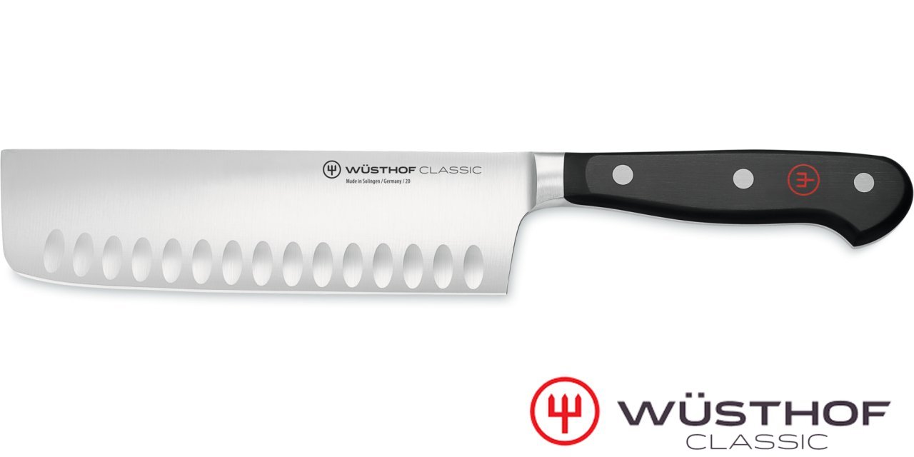 Lama tipicamente orientale da 17 cm a cui il brand tedesco ha aggiunto gli alveoli che aiutano il cibo a staccarsi dalla lama durante il taglio.