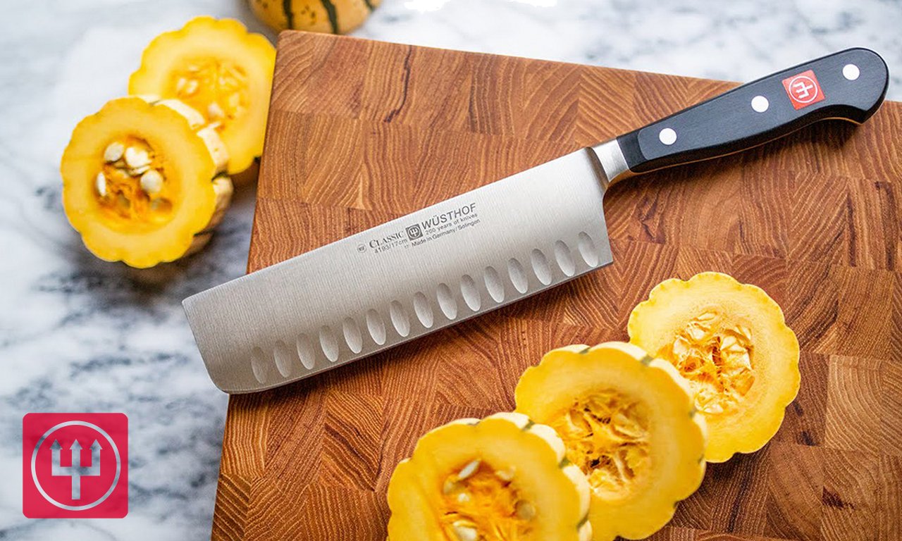 Il brand Wusthof ha riprodotto una lama della tradizione giapponese innovandola, ha infatti aggiunto sulla lama che in questo caso è simmetrica, degli alveoli adattando questa forma di lama anche all’uso occidentale.