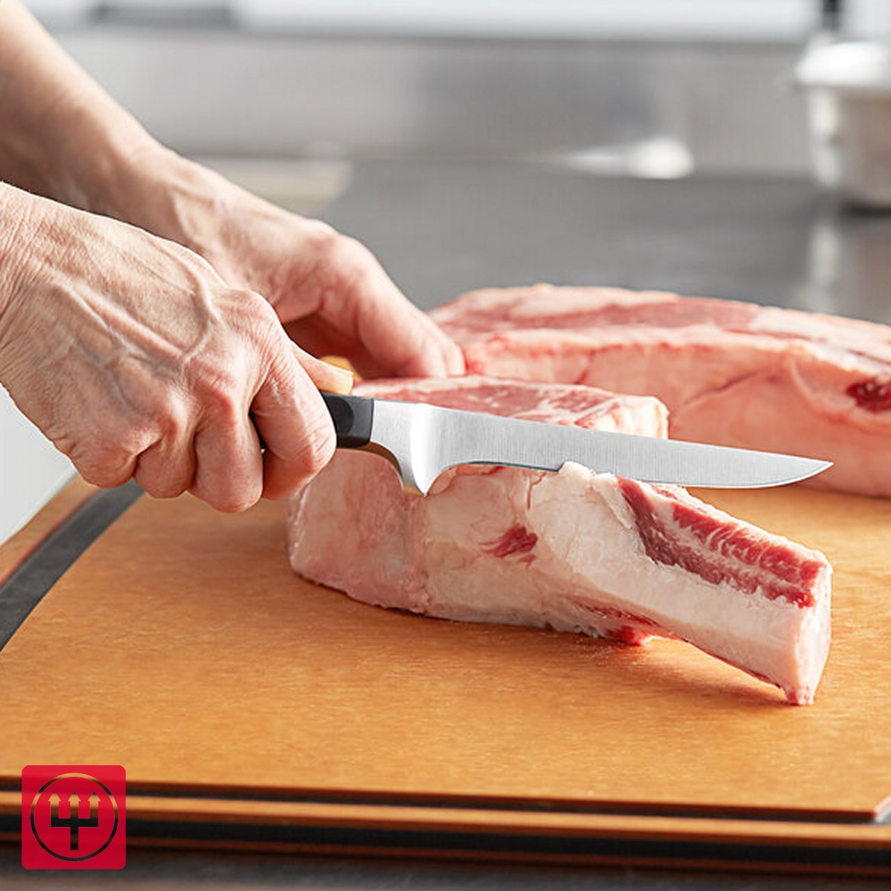 Questa tipologia di coltello da disosso è in realtà molto simile a quella che usano i macellai, ma a differenza loro che lavorano pezzature di carne molto più grandi e hanno bisogno di una lama più flessibile, questo coltello è adatto invece a pezzi di carne più piccoli.