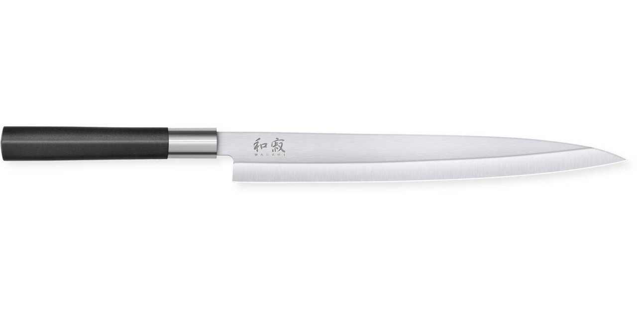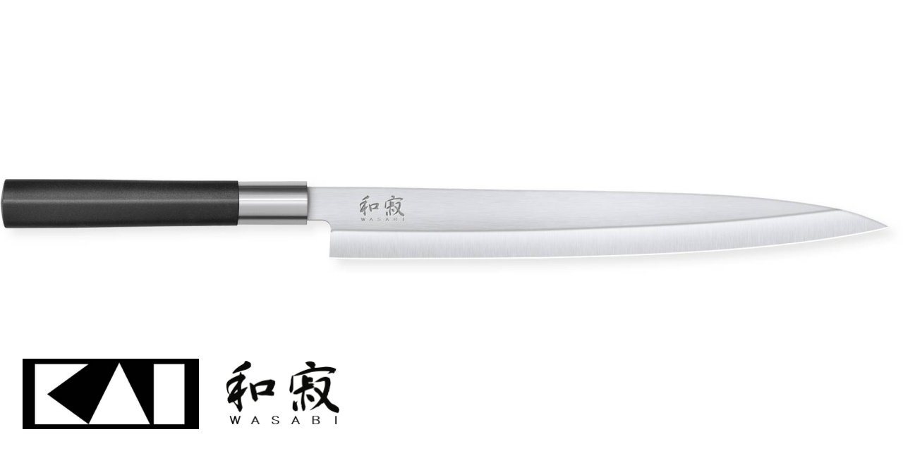 Coltello Kai Yanagiba costituito da lama asimmetrica da 24 cm ideale per via della sua lama lunga e affilata, per la preparazione di sushi o per sfilettare pesci di grandi dimensioni.