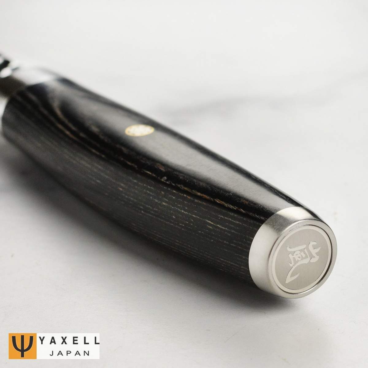 L’impugnatura si adatta perfettamente al palmo della mano ed è realizzata in legno pakka di faggio, una combinazione di resina e legno che lo rende resistente al calore all’umidità, nella parte centrale presenta lo stemma della famiglia samurai mentre sul fondo è inciso il logo kanji di Yaxell.