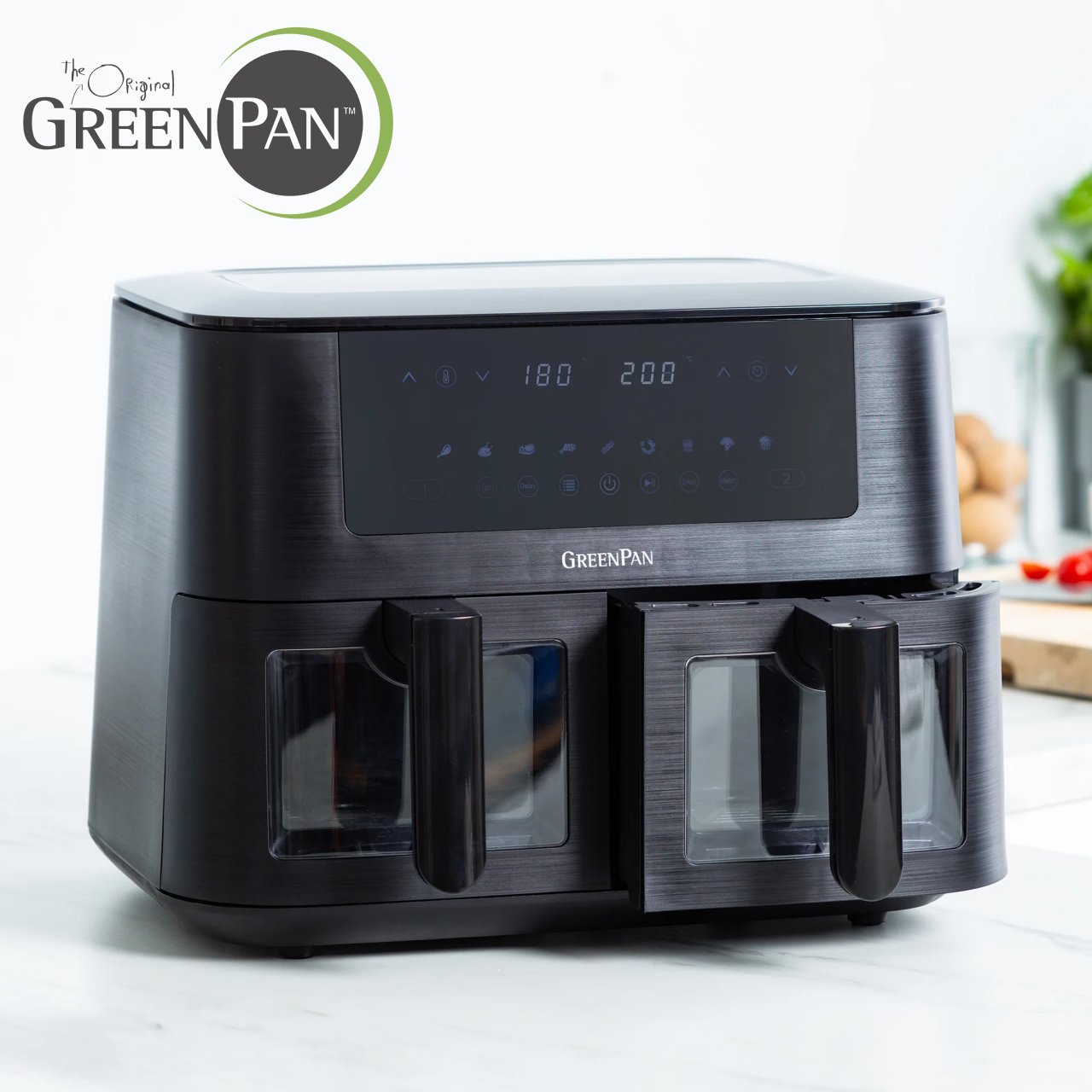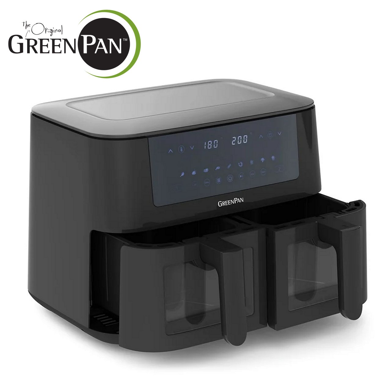 La friggitrice ad aria GreenPan Dual Zone da 8 litri con 10 programmi preimpostati e doppio cestello per poter preparare contemporaneamente due cibi diversi.