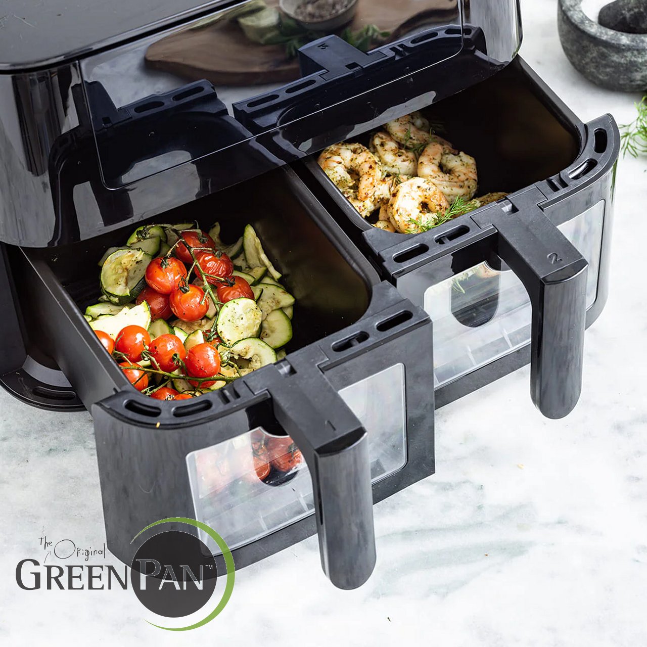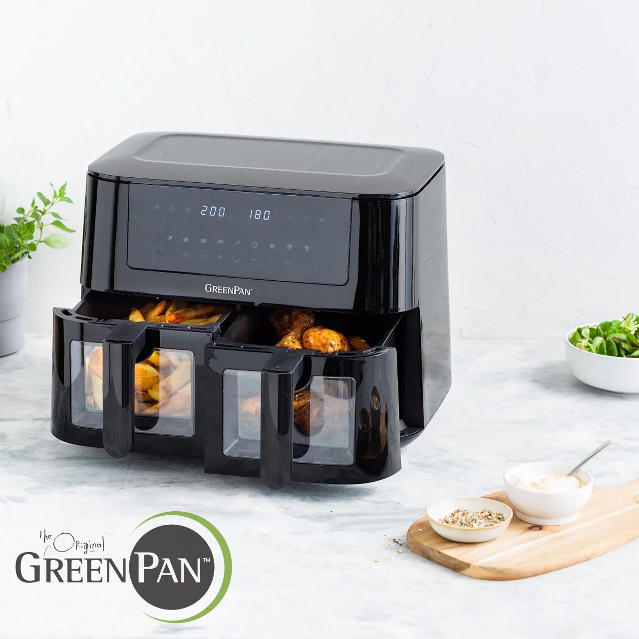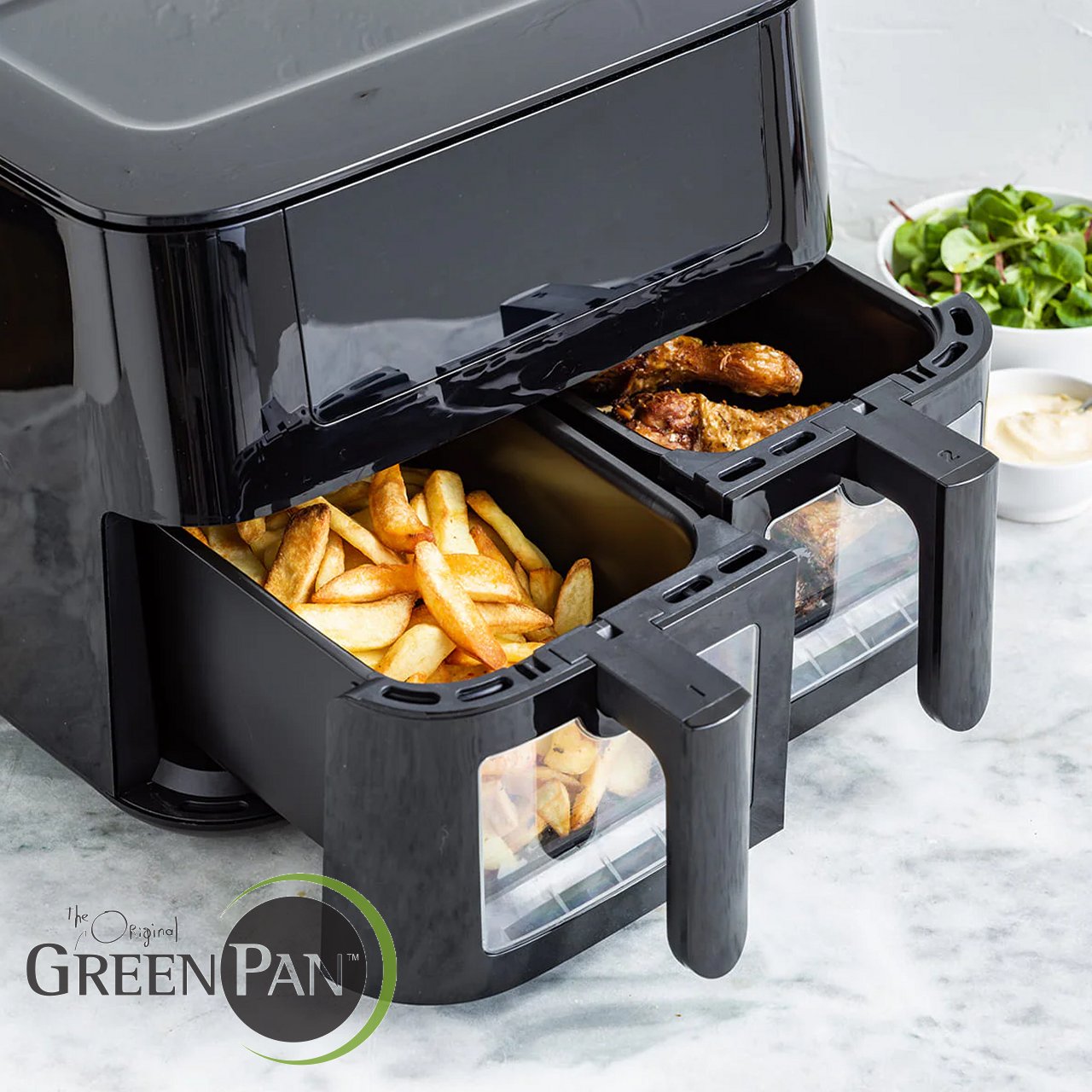 La friggitrice ad aria GreenPan Dual Zone da 8L รจ la soluzione definitiva per risparmiare tempo e cucinare un intero pasto in una volta!
