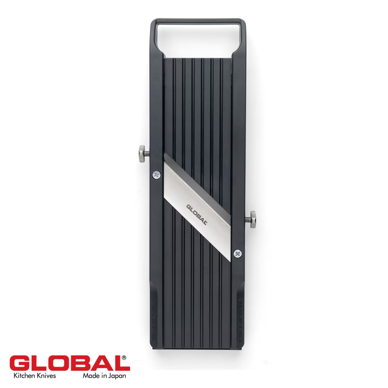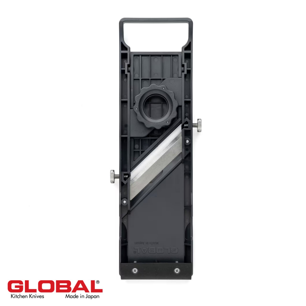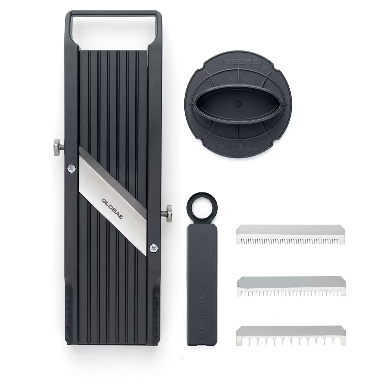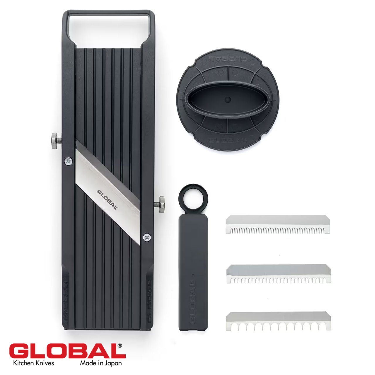 Mandolina professionale giapponese Global in acciaio inossidabile e plasticaa BPA free con una dimensione di taglio da 6,4 cm, completa di 3 lame intercambiabili in acciaio inox e custodia.