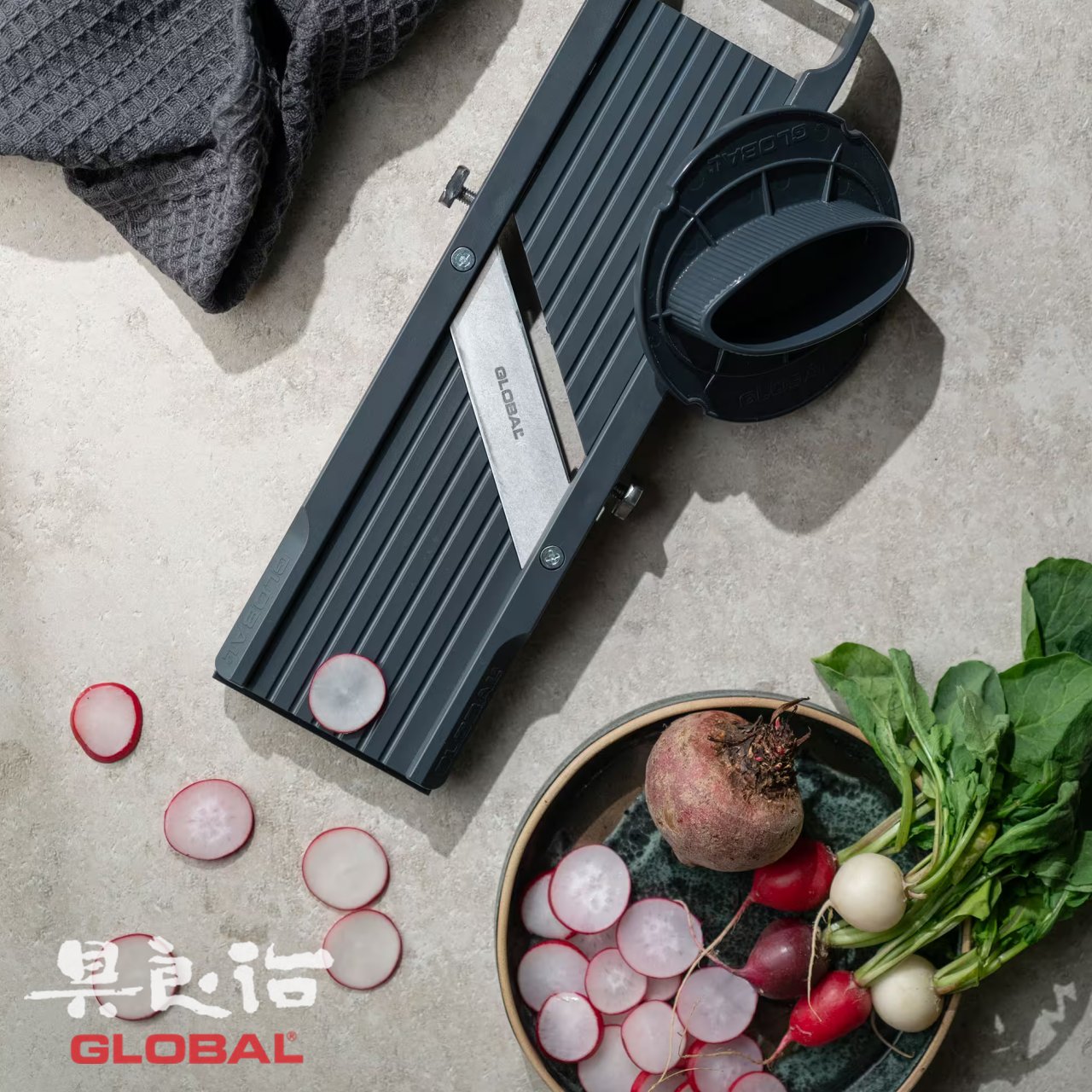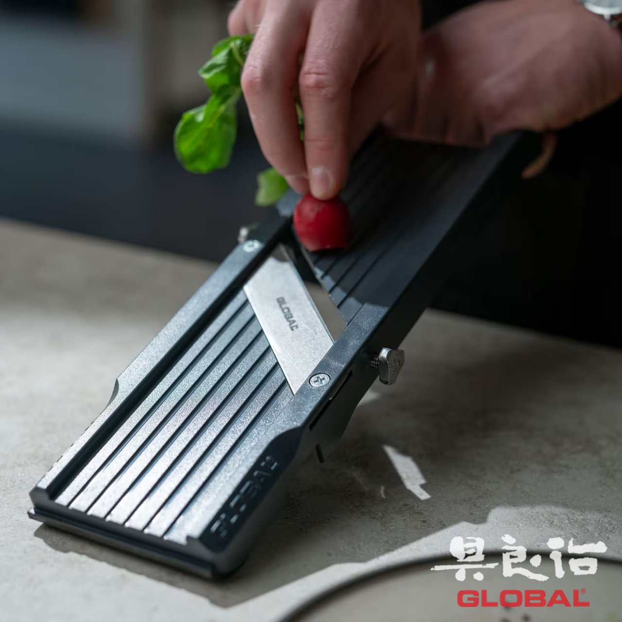 Mandolina professionale di Global GSL-64 รจ uno strumento da cucina utile e pratico, ideato per chef ambiziosi che desiderano la massima precisione, velocitร  e sicurezza nel tagliare verdure e ortaggi.