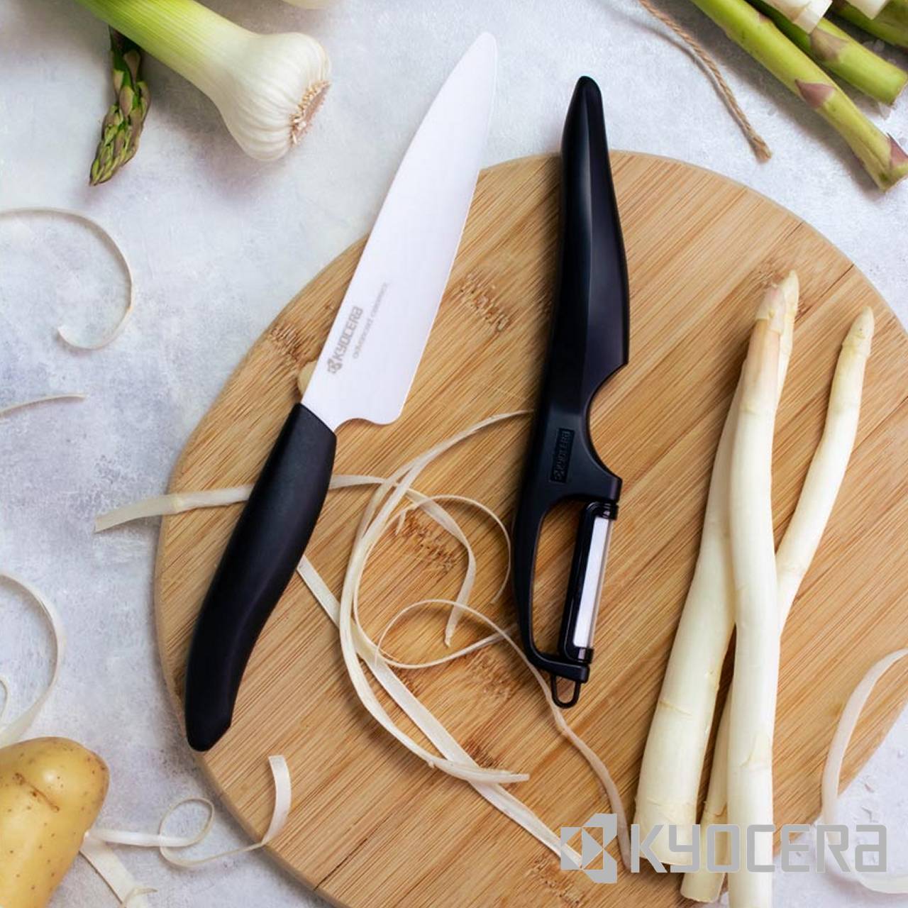 • Kyocera Shin Withe: questa linea è stato realizzata dal brand Kyocera per rispondere nel migliore dei modi alle richieste dei professionisti e dei principianti più esigenti. Oltre alle altissime prestazioni di taglio, questi coltelli da cucina utilizzano una combinazione di colori estremamente elegante. Il taglio facile è sicuro è garantito dalla perfetta combinazione tra la lama in ceramica ultra-tagliente e il manico ergonomico, dall'ottima aderenza e dalla facile maneggevolezza che assicura un taglio estremamente facile e preciso;