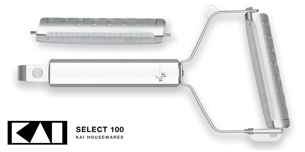 Pelaverdure in acciaio inox giapponese a forma di T con lama inclinata. Fornito con due lame intercambiabili con filo piatto e per julienne.
