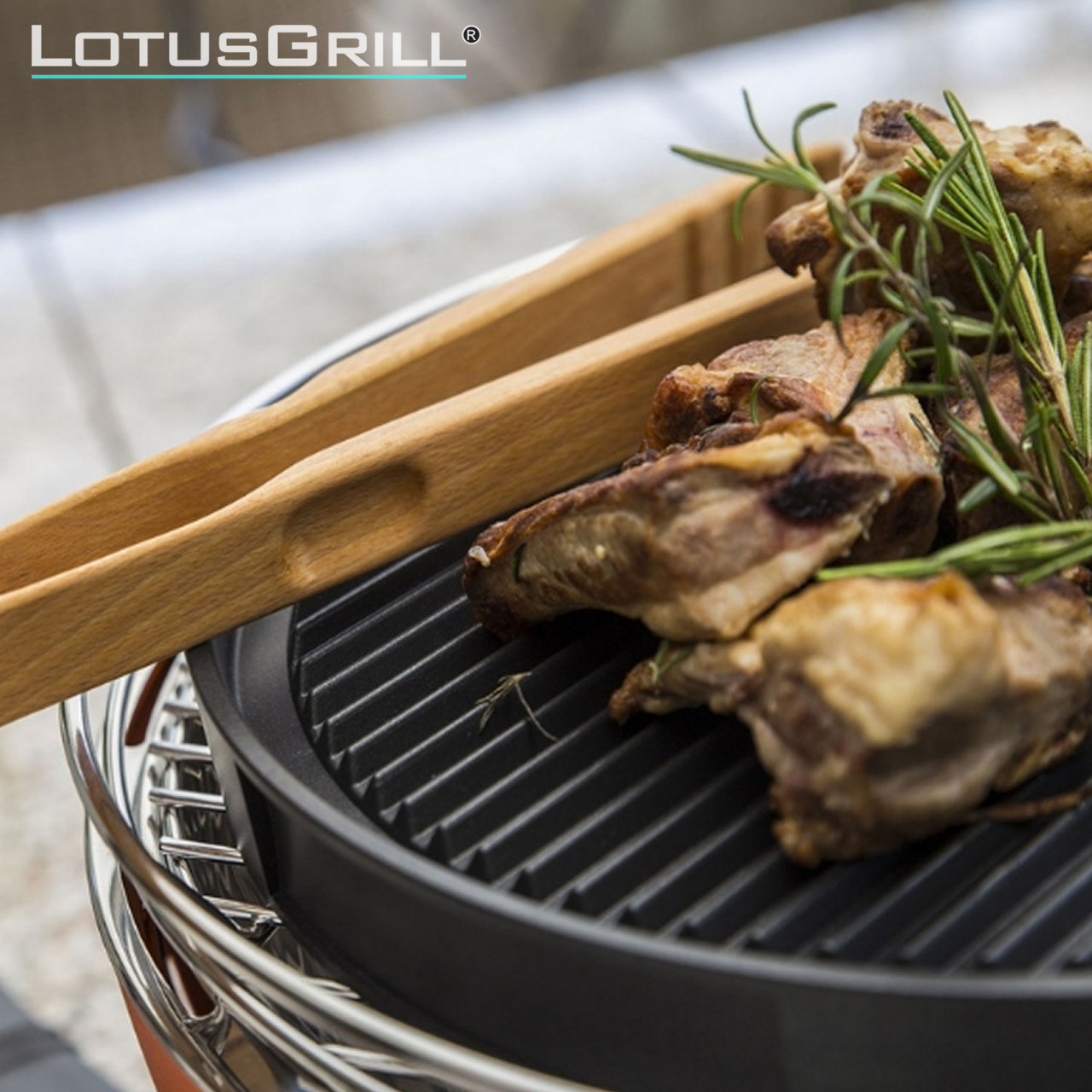 La piastra puรฒ essere inserita direttamente sopra la griglia del Lotus Grill oppure direttamente appoggiata sulla carbonella, ed รจ molto facile da pulire grazie allo speciale rivestimento antiaderente LOTAN.