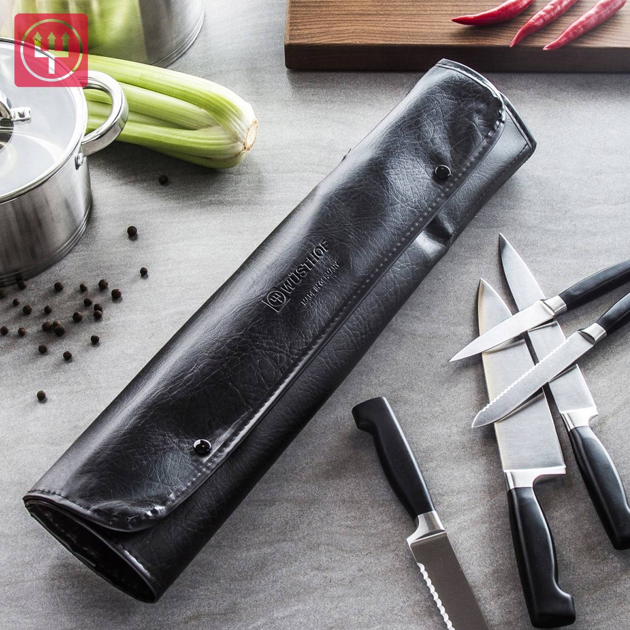 Il rotolo è in pelle sintetica, poco ingombrante ed è ideale sia per il professionista che per il cuoco amatoriale e appassionato, dotato di due bottoni automatici per la chiusura.