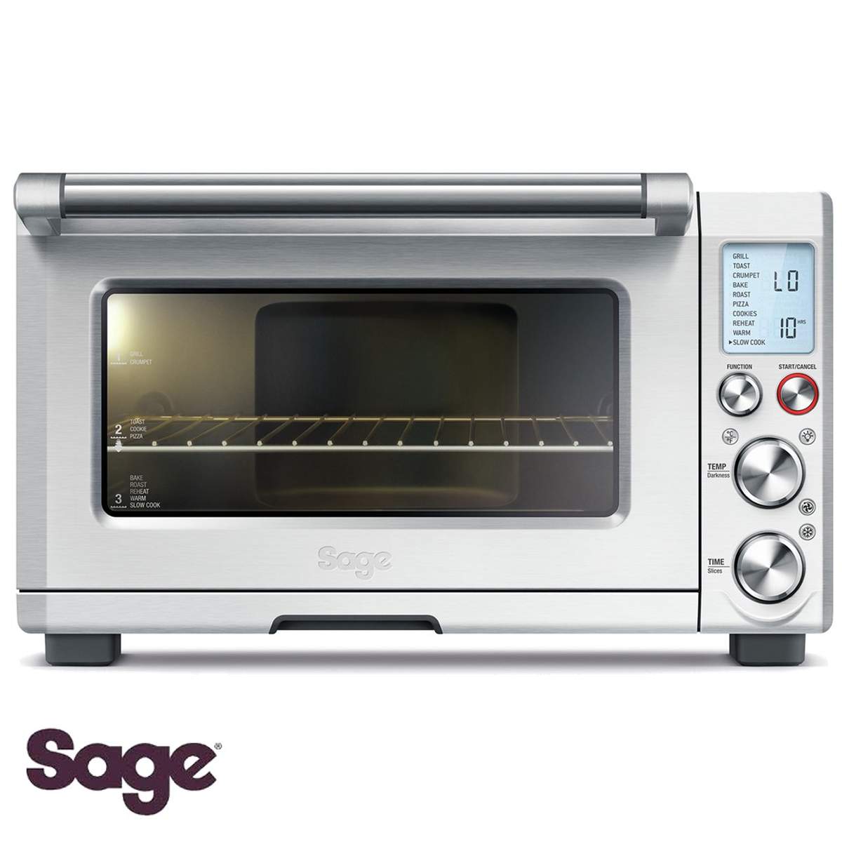 Le 10 funzioni di cottura prevedono: Toast 6 slices (tostare 6 fette di pane), Bagel, Bake (per cuocere al forno), Roast (arrostire), Broil (grigliare), Pizza, Cookies (biscotti), Reheat (riscaldare), Warm (mantenere in caldo), Slow Cook (cottura lenta).