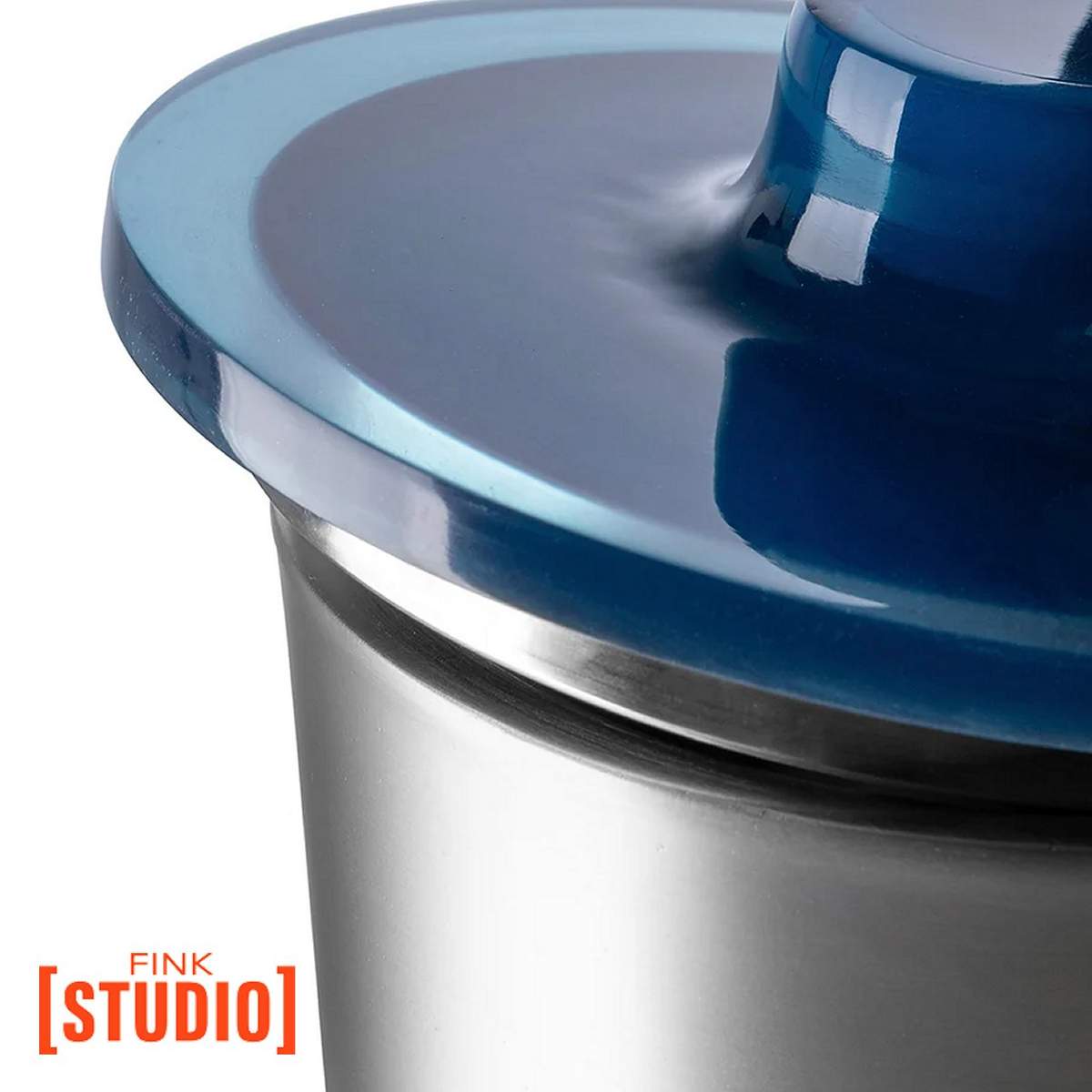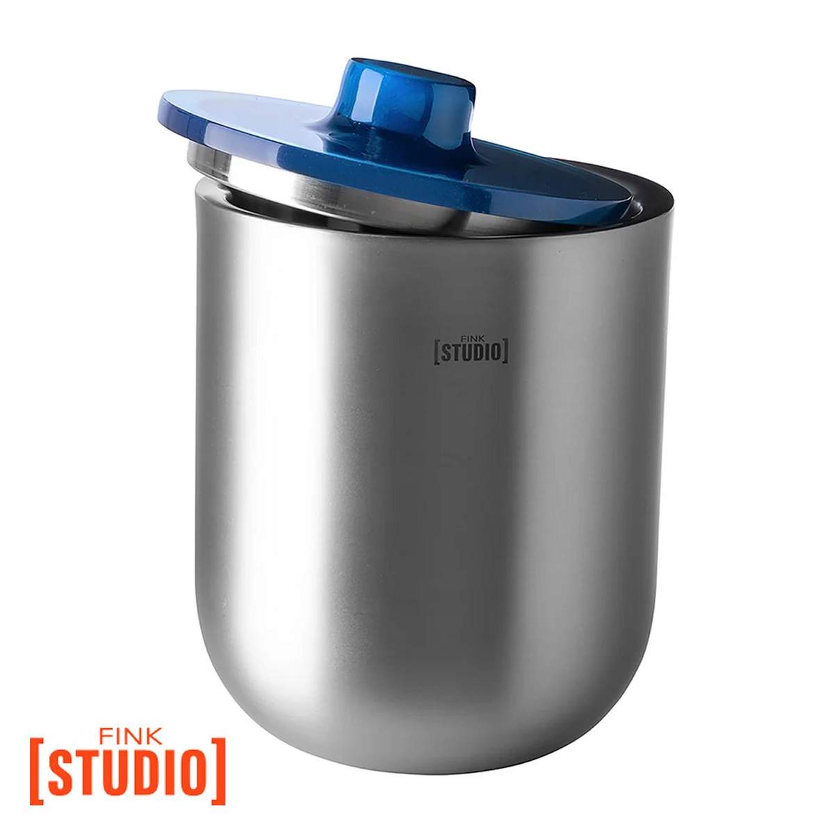 La struttura principale è realizzata in acciaio inox di alta qualità, con una superficie grigio‑matt elegante, mentre il coperchio è in resina artigianale colorata (sfumature di blu e turchese) che aggiunge un tocco di personalità e vivacità all’oggetto.