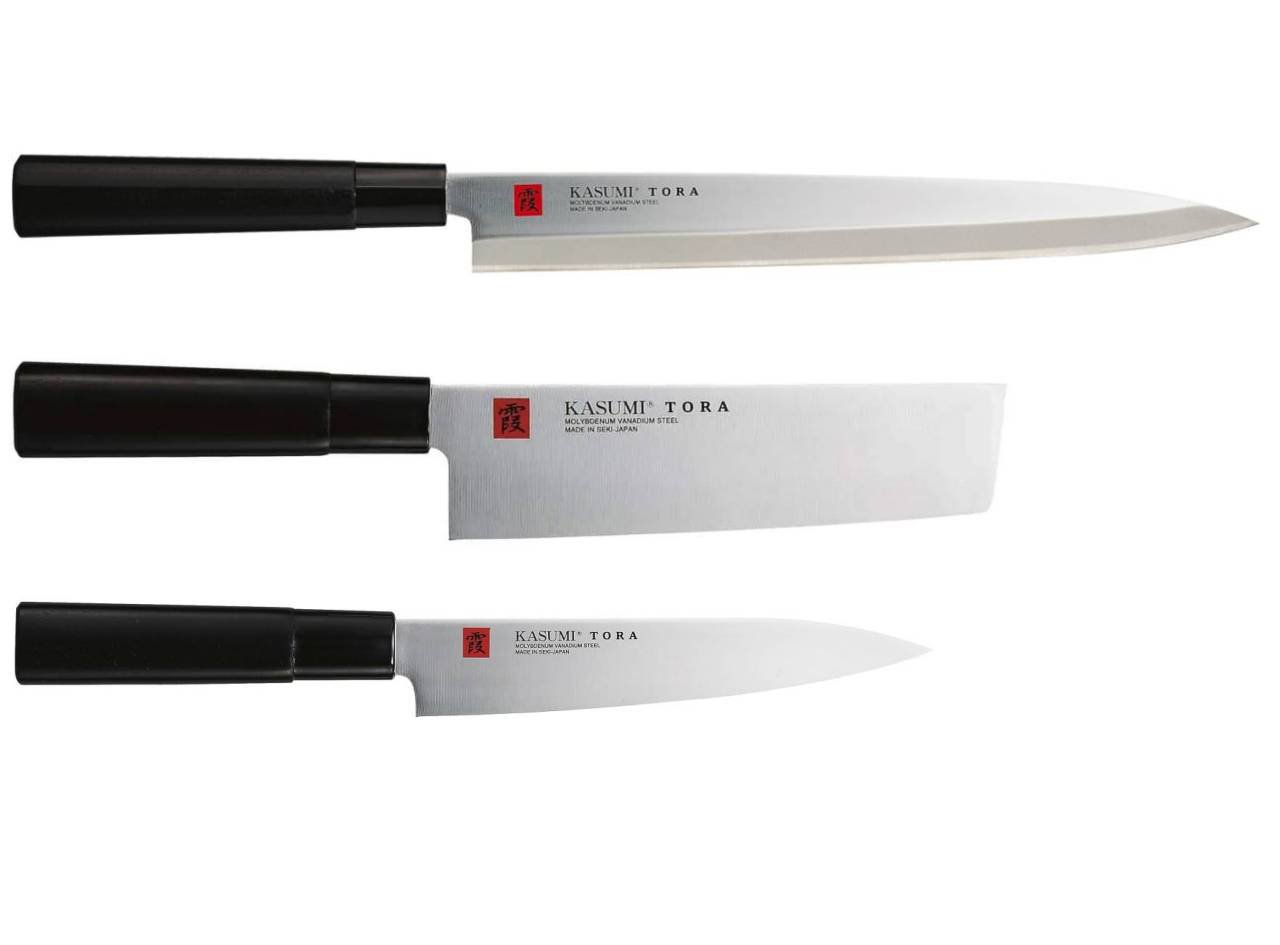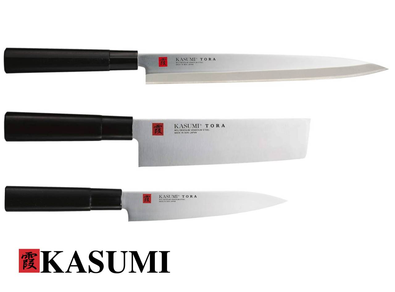 Coltelli Kasumi Tora: è una gamma di coltelli perfetta per i principianti che si stanno approcciando al mondo della cucina e più in generale del taglio. Le migliori tecnologie e il meglio dell'artigianato vengono impiegati per la creazione di questa linea che utilizza un particolare tipo di acciaio per la produzione della lama garantendo prestazioni di taglio eccellenti, alta resistenza alla ruggine e semplicità di affilatura. Leggerezza, comfort e lunga durata sono garantiti dal manico in puro legno.