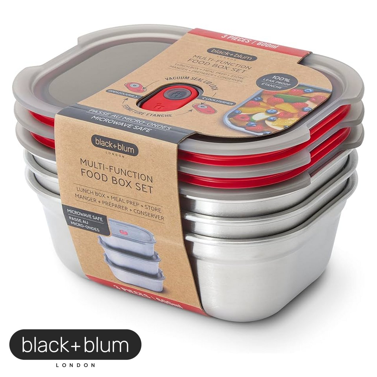 Il Set Lunch Box Black+Blum FBSSBXPACK3 include 3 contenitori da 600โ€ฏml ciascuno, ermetici, impilabili e sicuri per microonde, freezer e lavastoviglie, ideali per pasti freschi ovunque.