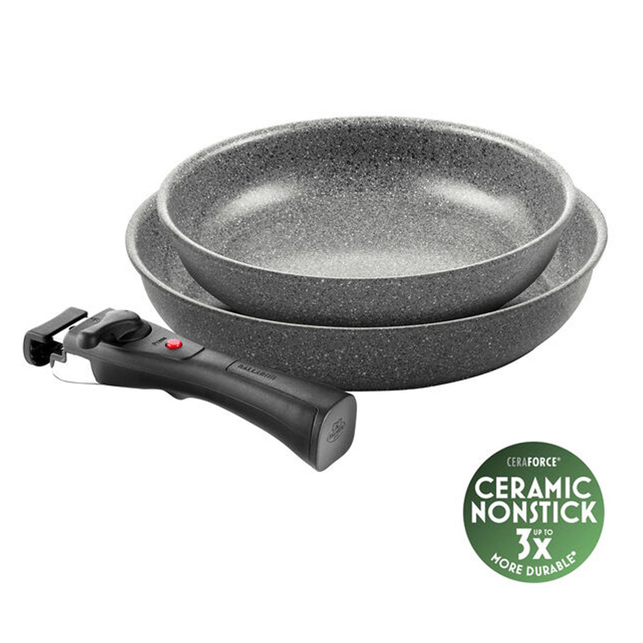 Le padelle sono dotate di rivestimento antiaderente di alta qualità, ideale per cucinare in modo più sano con meno grassi e per facilitare la pulizia dopo l’uso. Il sistema con manico staccabile permette di impilare facilmente le padelle, ottimizzando lo spazio in cucina e rendendo il set perfetto anche per ambienti più piccoli.