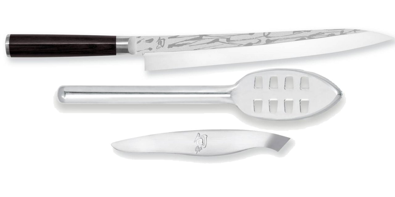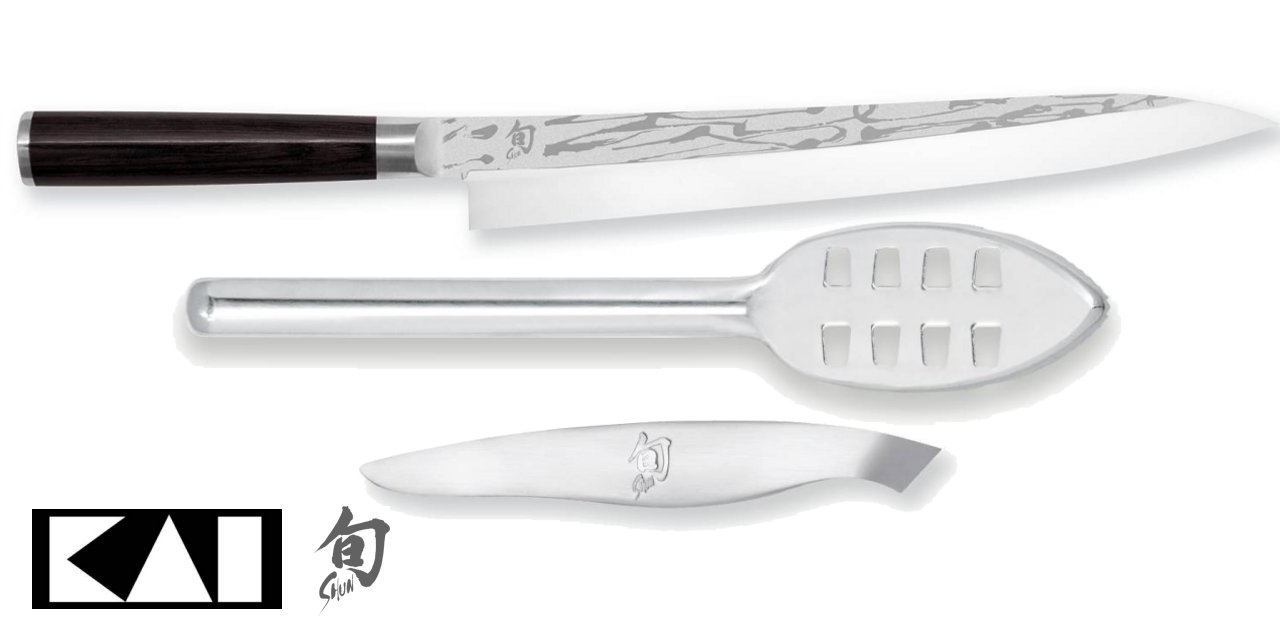Set composto dal coltello Yanagiba della linea Shun Pro Sho, in acciaio VG 10 con manico in legno pakka e due accessori per la preparazione del pesce ovvero una pinza per eliminare le lische e uno squamatore.