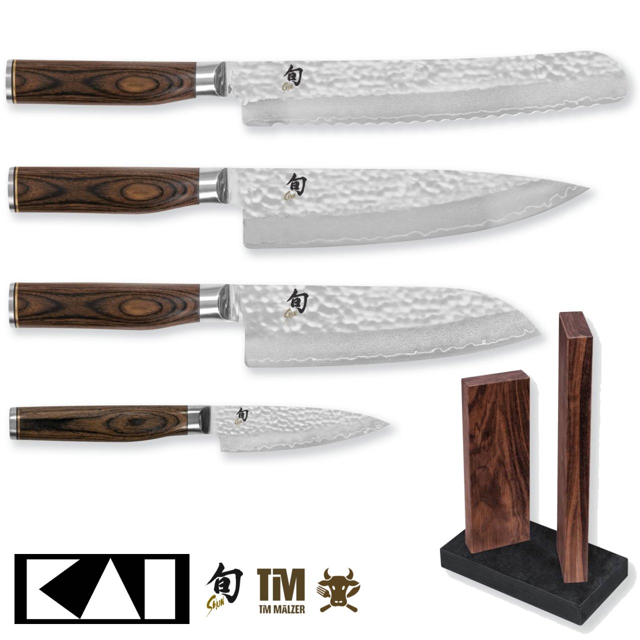 Bellissimo ed elegante set composto da 4 coltelli Kai della linea Shun Premier Tim Malzer combinati con uno splendido ceppo magnetico Kai in legno di Noce.
