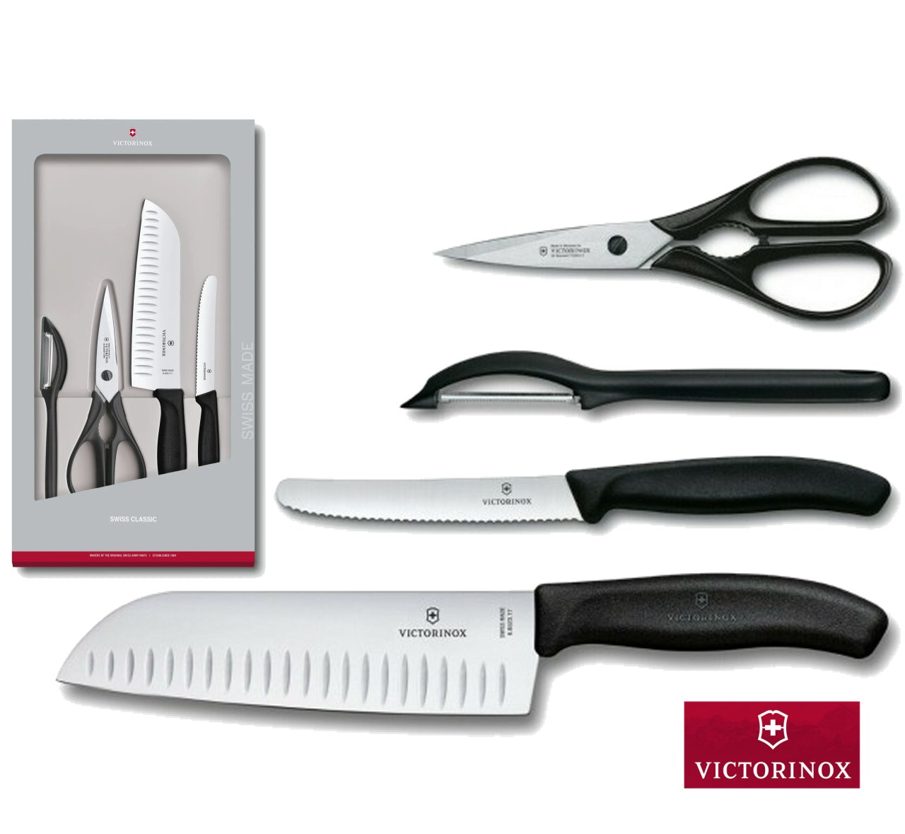 Il set è composto da quattro strumenti della linea Swiss Classic con impugnatura ergonomica nero in poliammide e lama in acciaio inox, ed è confezionato in una elegante scatola regalo.