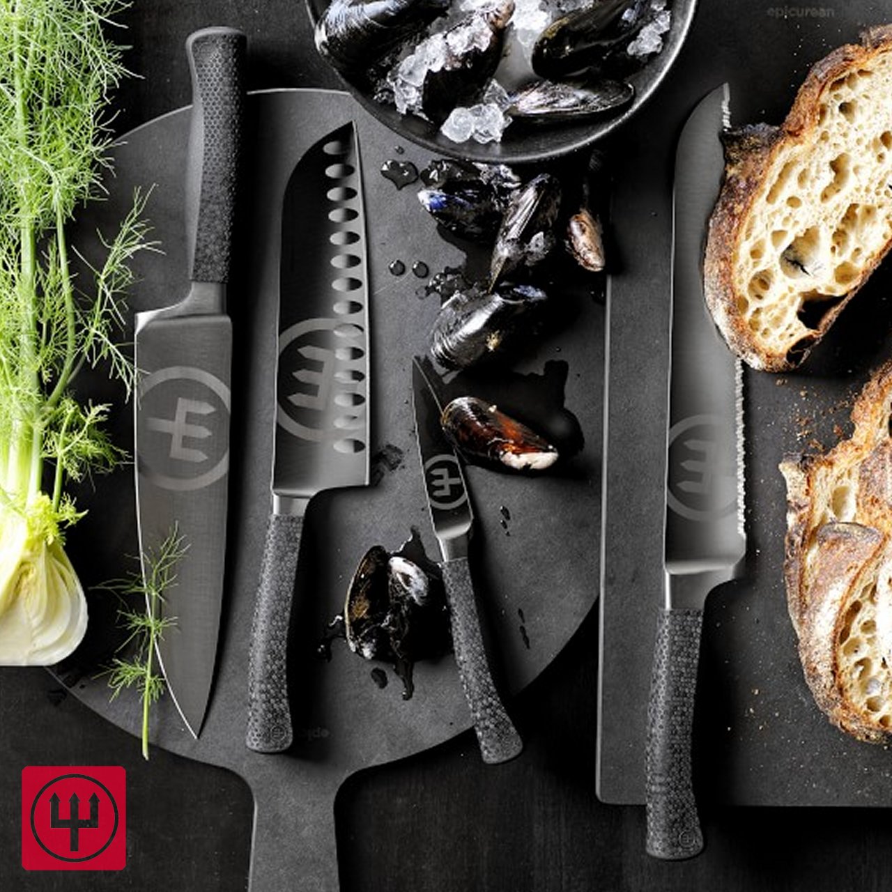 Coltelli WÜSTHOF Epicure: una linea di coltelli professionali WÜSTHOF che abbina l'efficacia e la vivacità del design giapponese con l'altissima qualità delle lame tedesche. Questi coltelli rappresentano il più alto grado d'innovazione grazie ai manici composti da fibre pure e resinose. La caratteristica differenziante è la qualità dell'acciaio utilizzato che, grazie al processo di forgiatura, garantisce massima affilatura e durezza.