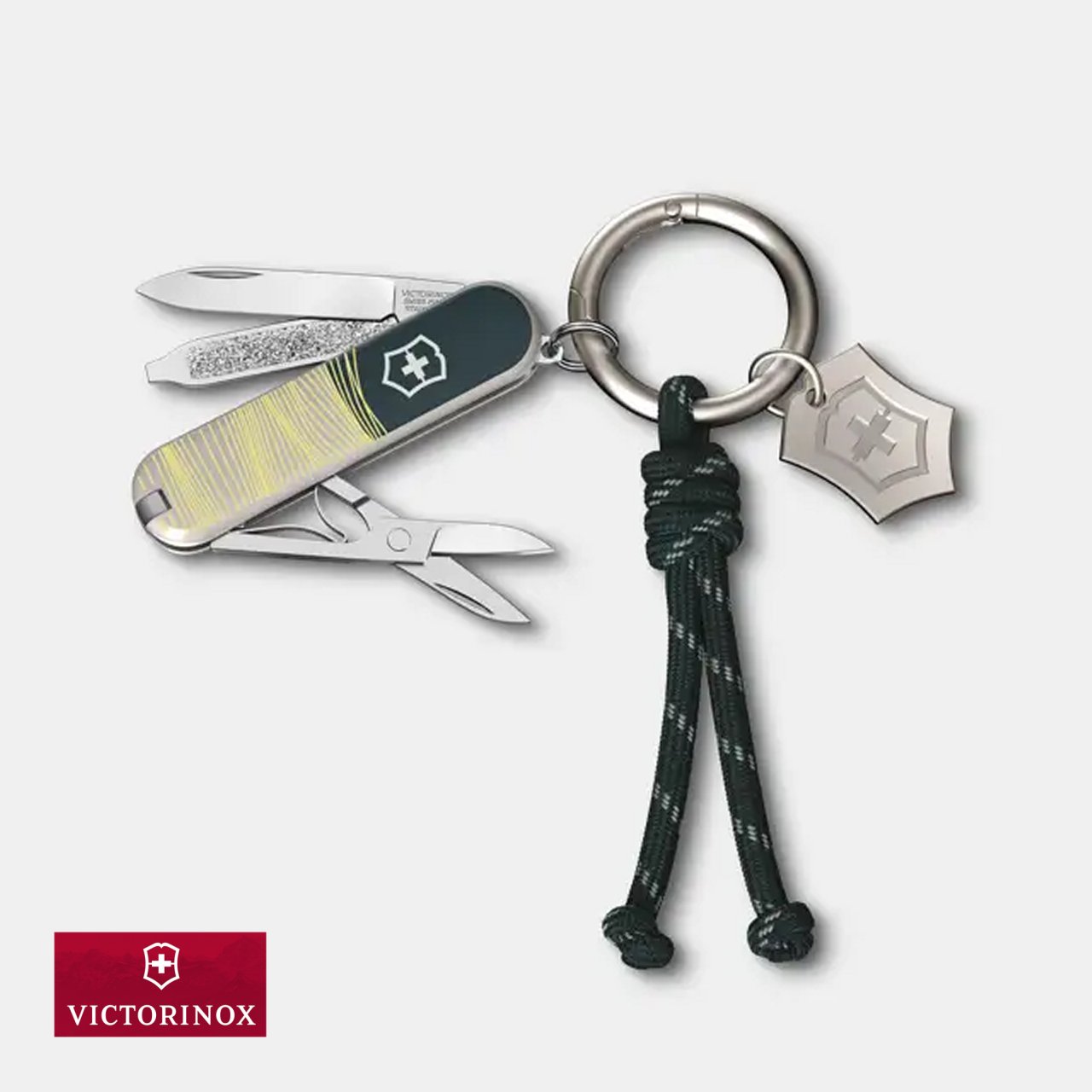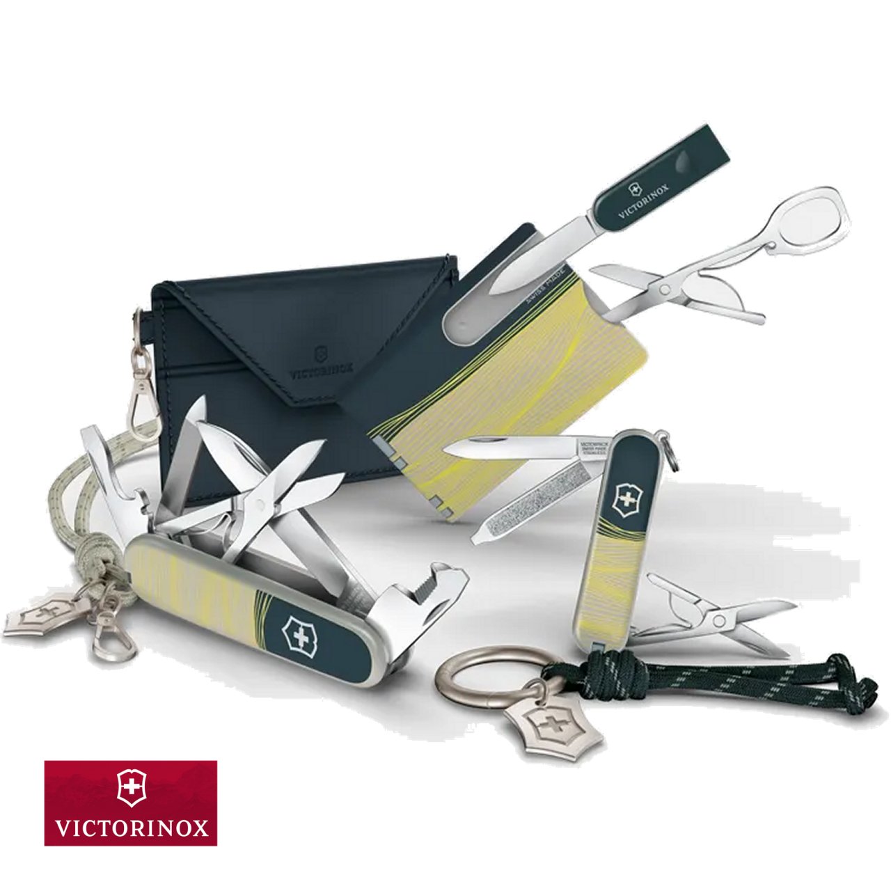– Victorinox Classic SD con 7 funzioni: Lama piccola / Forbici / Lima per unghie / Cacciavite 2,5 mm / Anello portachiavi / Pinzette / Stuzzicadenti / Portachiavi con ciondolo e cordino