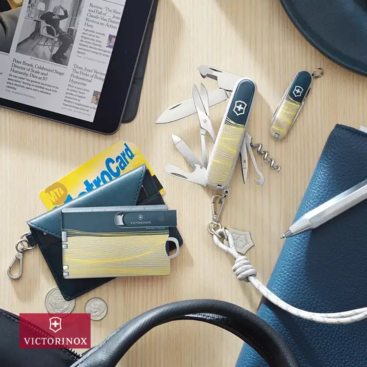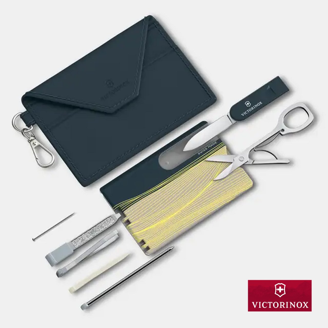 – Victorinox SwissCard con 10 funzioni: Tagliacarte / Forbici / Lima per unghie / Cacciavite 2,5 mm / Spillo / Pinzette / Stuzzicadenti / Penna a sfera / Lima per unghie / clip porta carte / porta carte coordinato
