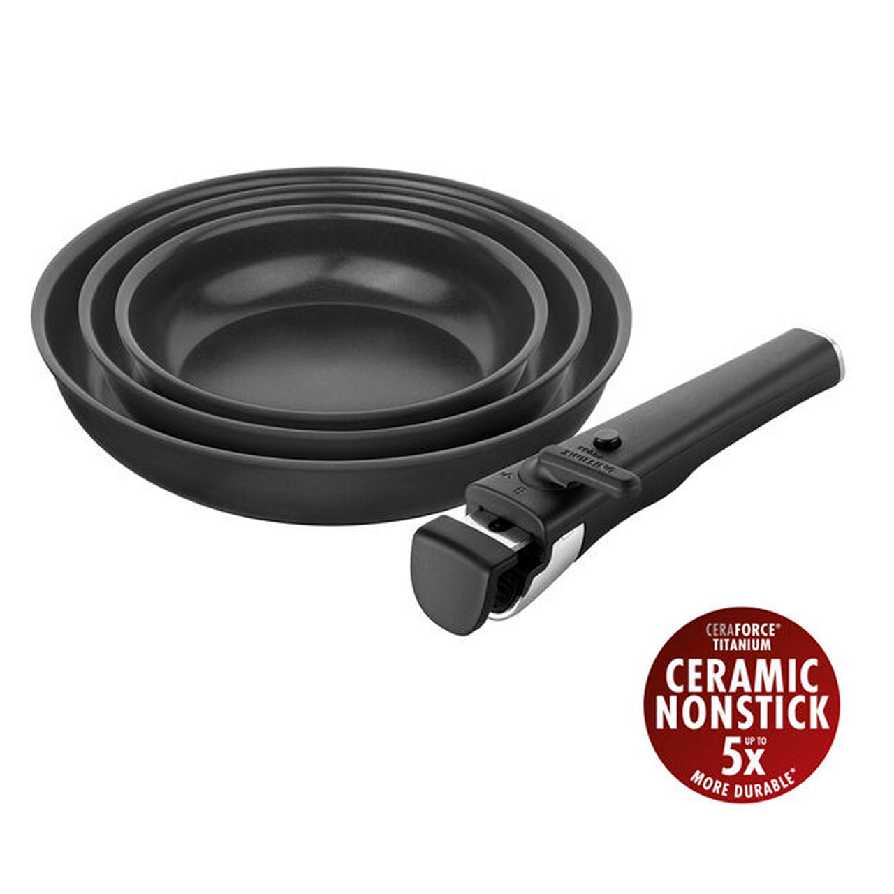 Grazie al sistema con manico removibile, le padelle possono essere impilate e riposte facilmente, riducendo al minimo l’ingombro in cucina. Inoltre, senza manico, sono adatte anche alla cottura in forno e possono essere lavate comodamente in lavastoviglie.