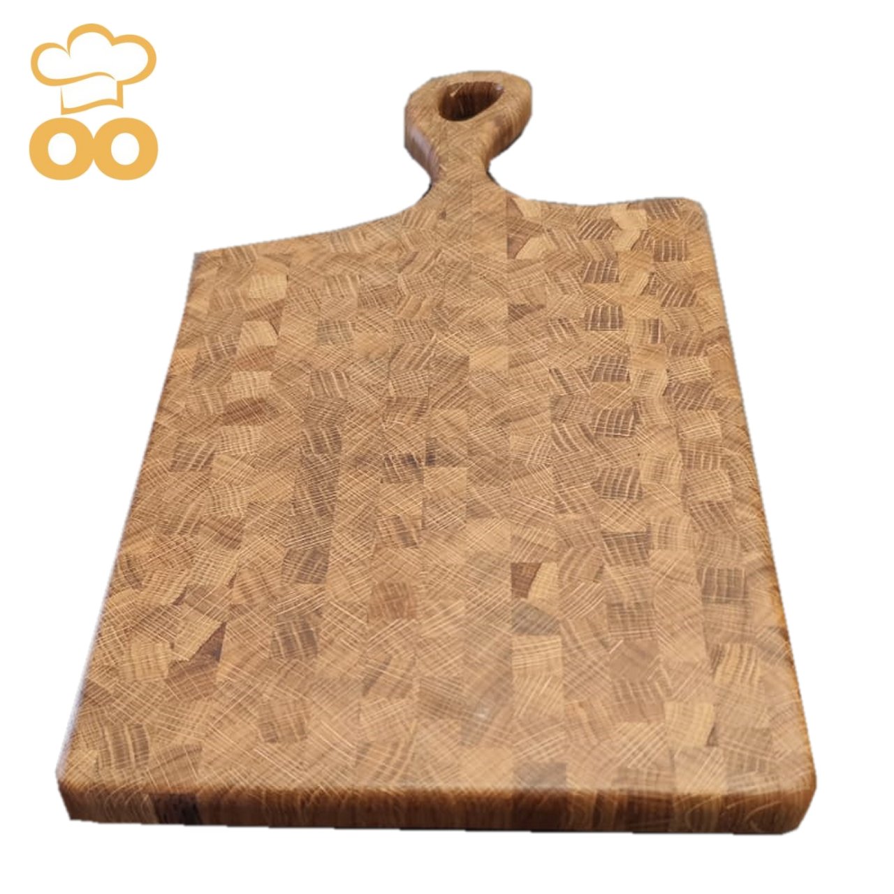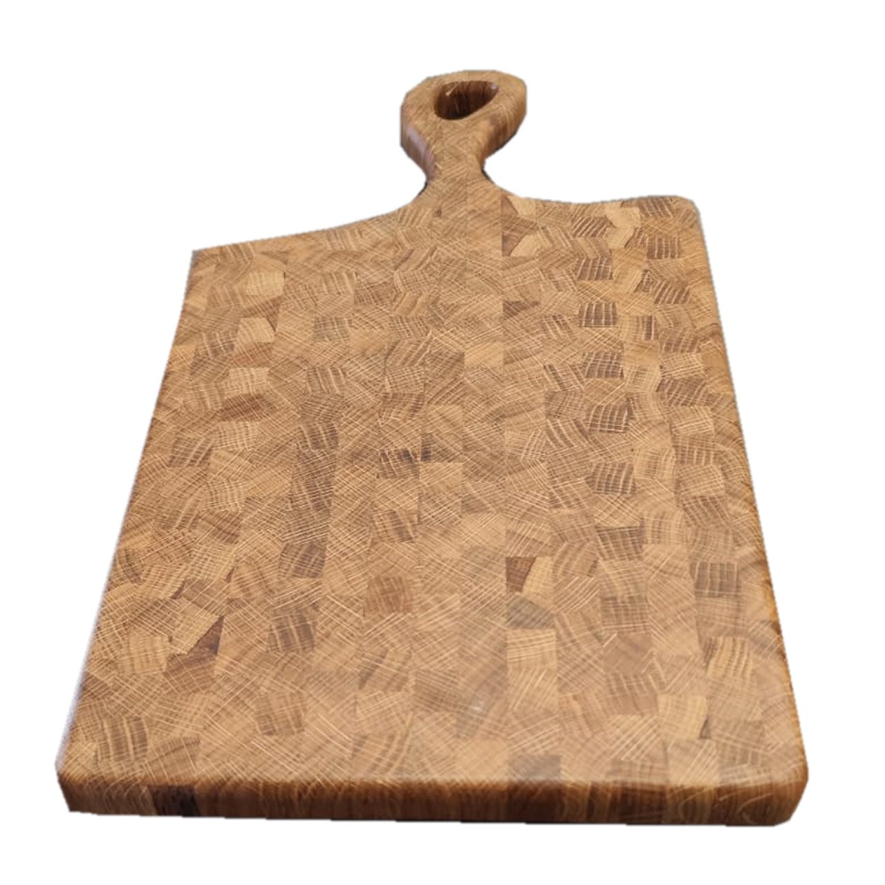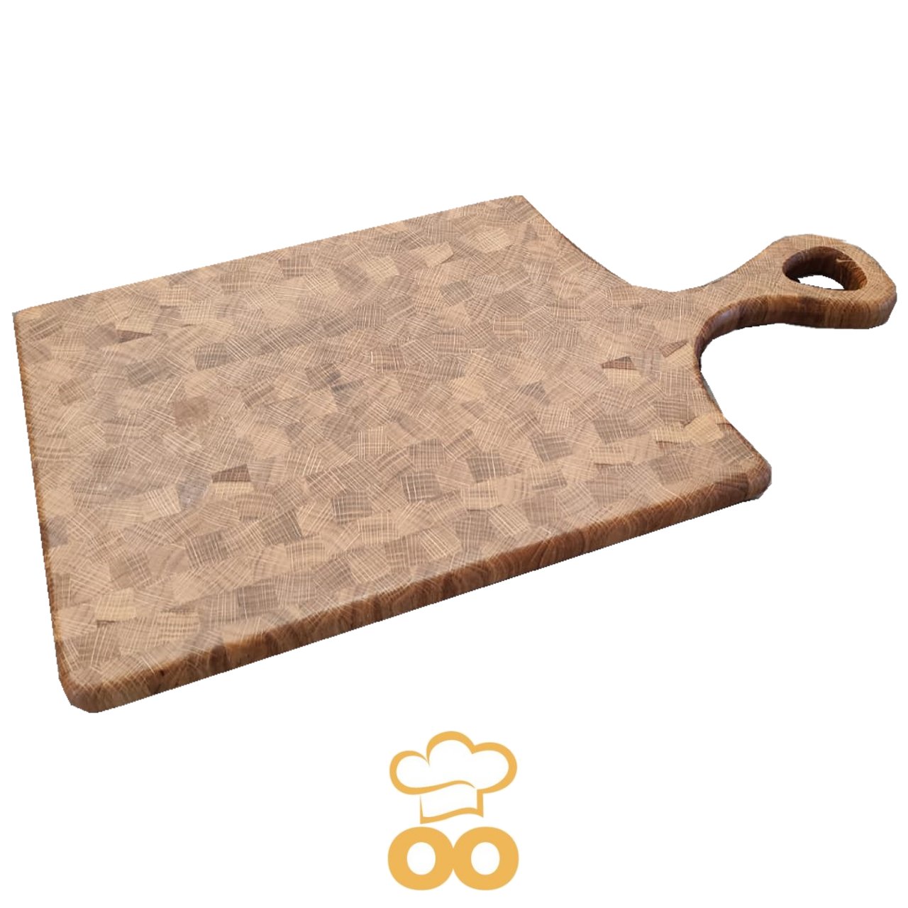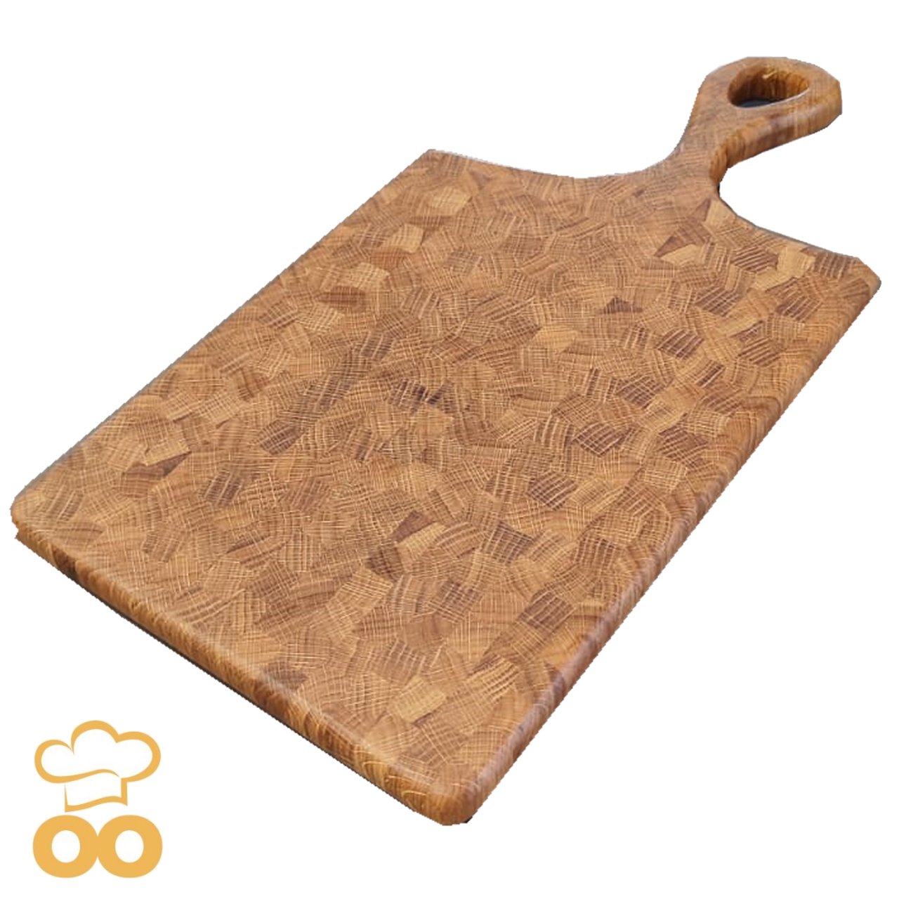 Tagliere artigianale realizzato in legno di rovere, dotato di comodo manico con foro, adatto sia al taglio che alla presentazione in tavola degli alimenti.