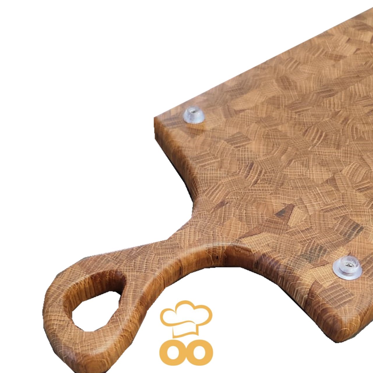 Tagliere realizzato artigianalmente in legno di rovere, dotato di pratico manico e di piedini antiscivolo che lo rendono stabile su tutte le superfici.