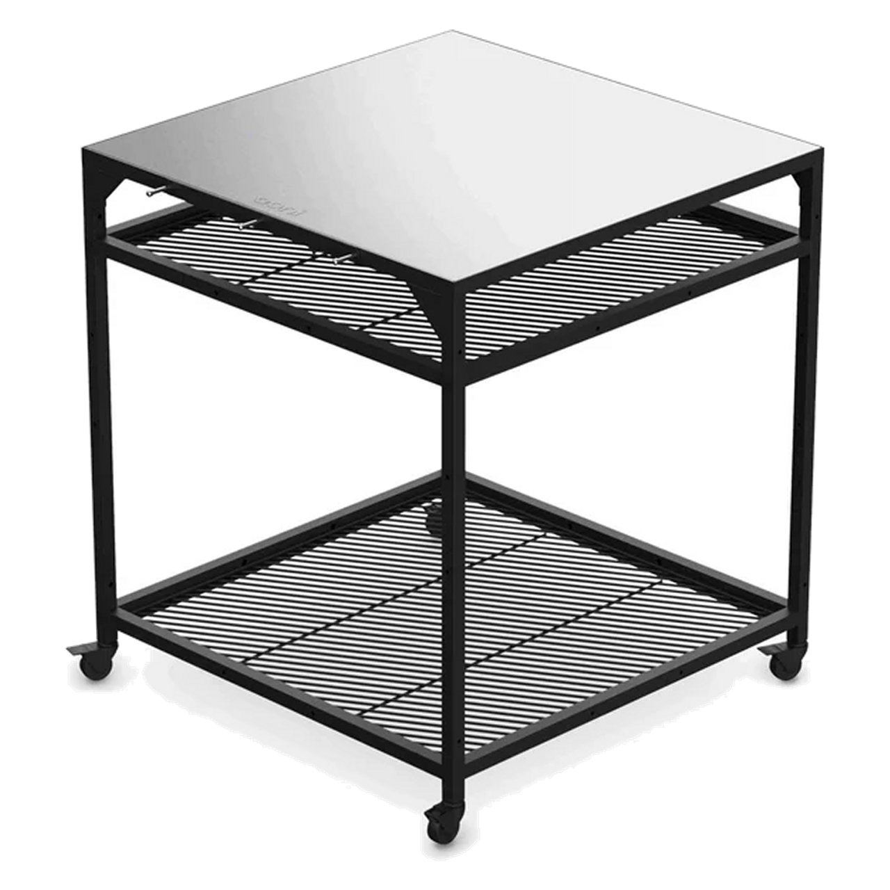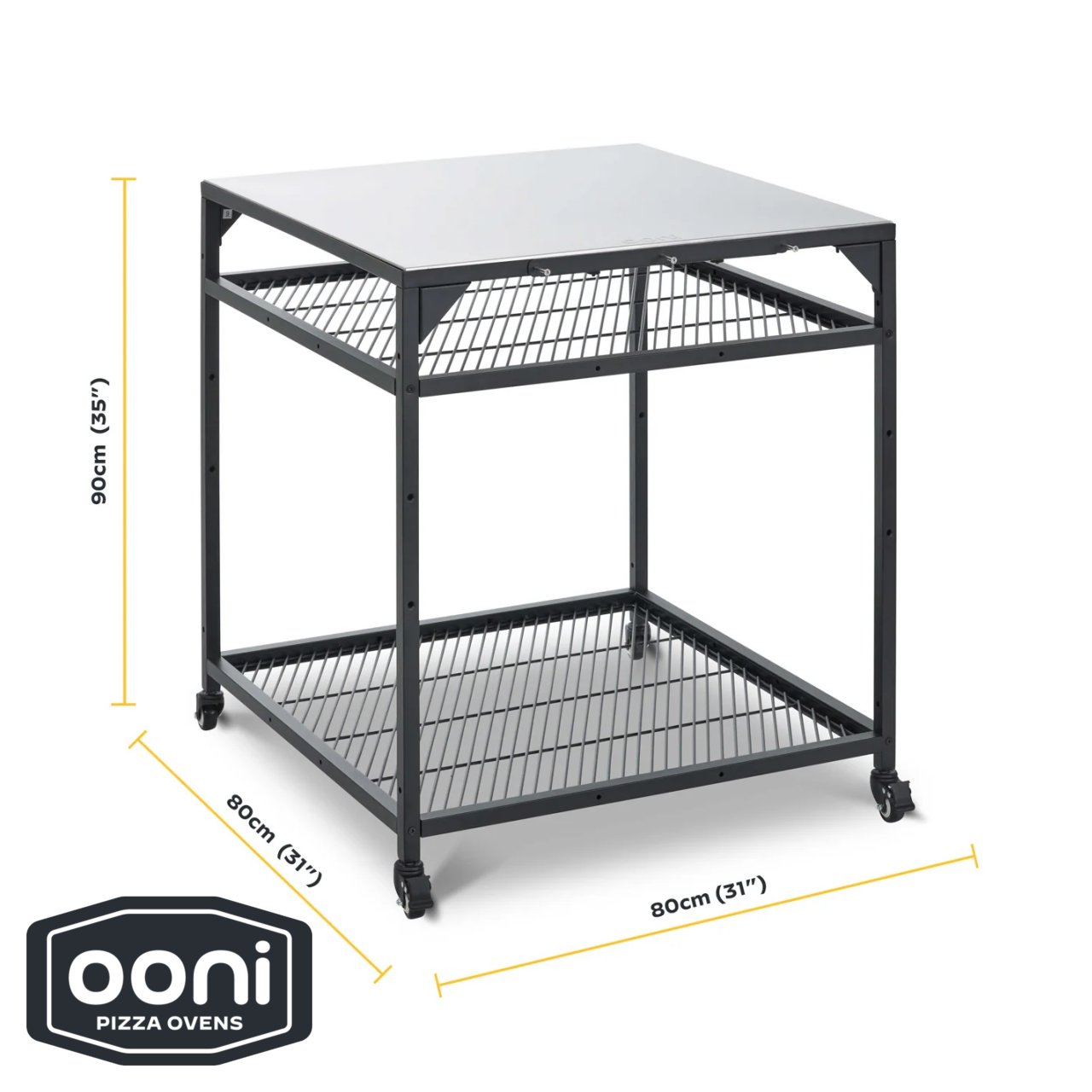 Il tavolo modulare grande è compatibile con tutti i forni pizza Ooni, realizzato in acciaio al carbonio verniciato è dotato di ruote con blocco, ripiani regolabili e ganci integrati.
