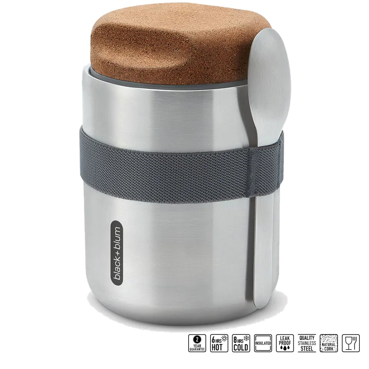 Contenitore termico ermetico, realizzato in acciaio inox con coperchio in sughero naturale, dotato di cucchiaino in acciaio inox e cinturino in nylon per portare i tuoi cibi ovunque.